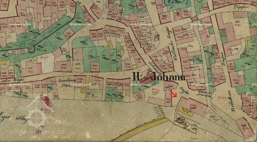 Objekt bývalého mlýna při Ohři na Špitálském předměstí se nachází východně od kostela Stětí sv. Jana a bývalým klášterem johanitů. Severní průčelí je členěno vysokým řádem toskánských pilastrů (částečně zdvojeny, při nároží pouze jeden plochý pilastr). V levém dílu předstupuje čtyřosý symetricky řešený rizalit. Fasáda je horizontálně členěna (barevnost bílá, západní průčelí- okrová) jednoduchou kordonovou římsou (přetínají ji pilastry) a profilovanou korunní římsou. Okna v přízemí a v prvním patře zazděna (dříve okna osazena v líci, čtyřkřídlá, patrně drobně dělená, ven otvíravá) orámována jemně profilovanými šambránami. V ose středního meziokenního pilíře je pilastr ukončen těsně nad kordonovou římsou a horní část zaujímá drobná obdélná kaplička zakončena trojúhelným štítem, prolomená polokruhovou nikou zaklenuta konchou. Ustupující pravý díl na šířku okenní osy – tříosý – členěn vysokým řádem toskánských pilastrů. Levé travé je širší než obě zbývající a je vymezeno dvojicí pilastrů. Prolomeno asymetricky umístěným portálem segmentově zakončeným (stlačeným obloukem). Archivolta vjezdového portálu je provedena ve štuku s mělkou lištou po obvodu s odstupněním. Zbývající dvě travé prolamují v patře dnes zazděná okna (okna v líci, čtyřkřídlá). Fasáda je horizontálně členěna soklem a profilovanou korunní římsou s dvojitým výžlabkem. Východní průčelí je v celé ploše nečleněné. Západní průčelí prolamuje dnes zazděný vstup se segmentovým záklenkem. Jižní průčelí je obrácené k Ohři a je celé spjato s provozním traktem mlýna, prolomeno funkčními otvory.