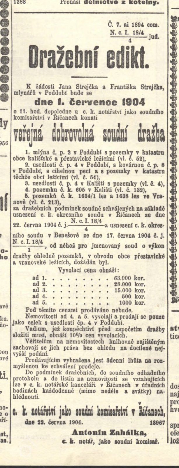 1902 František Strejček, v té době sloužil i jako zahradní restaurace. Na jedné budově dodnes patrný nápis "HOSTINEC".