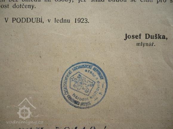 Koncem 19. století byl ve mlýně mlynářem František Duška, který vydal Kalendář mlýnů česko-moravských na rok 1899 - viz Ostatní. Scan úvodní stránky poskytla Jitka Filipcová-Dušková.