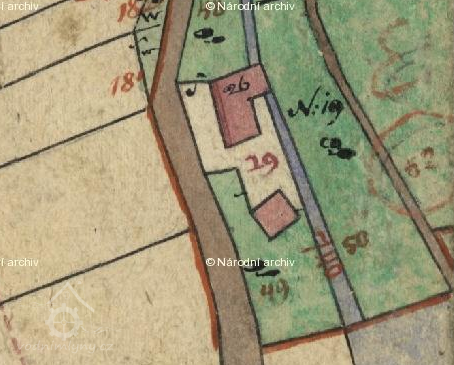 Kromě této mapy je objekt půdorysně zachycen také na mapě z roku 1909, reprodukované tamtéž. Podle popisu se jedná o kopii mapy M. Čermáka z roku 1806, překreslenou Aloisem Jírkem; originál Čermákovy mapy je dnes ale rovněž nezvěstný. Na této mapě je objekt, už nesoucí č. p. 19, označen jako mlýn, a jako nájemce ve vztahu emfyteuze (tedy dědičného nájmu) je uveden Václav Žilák.