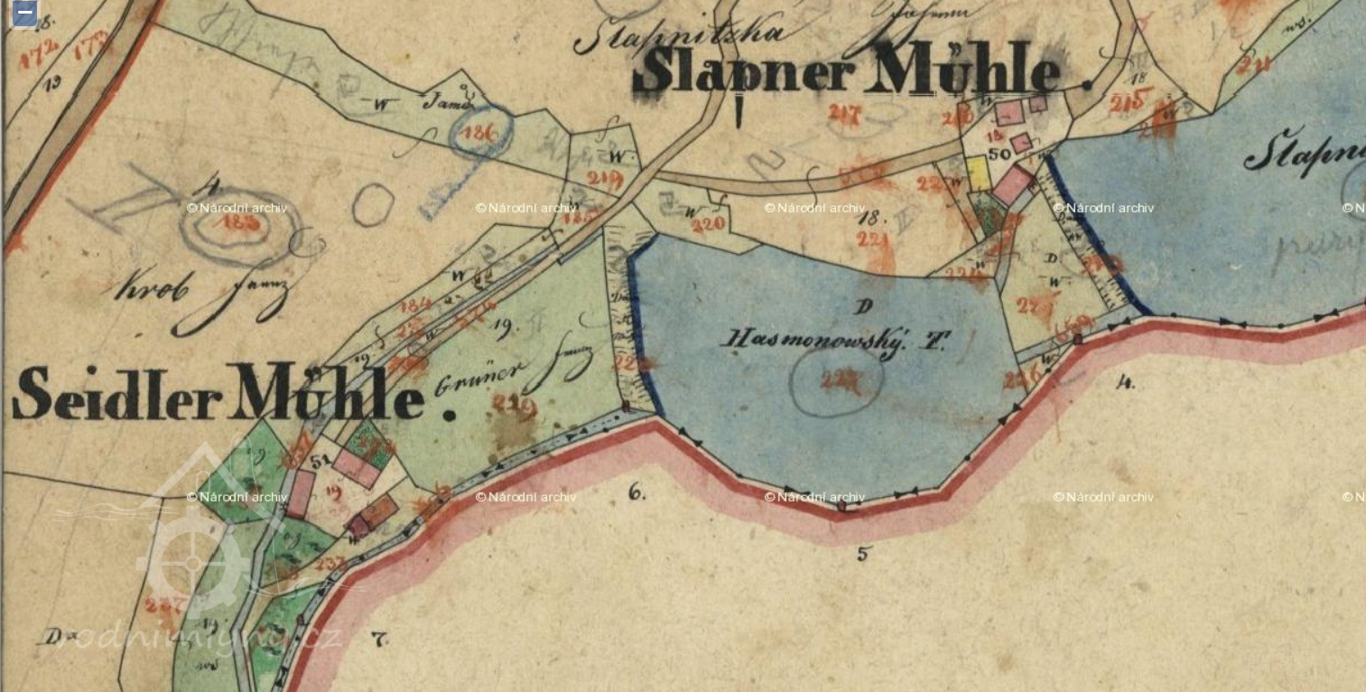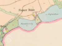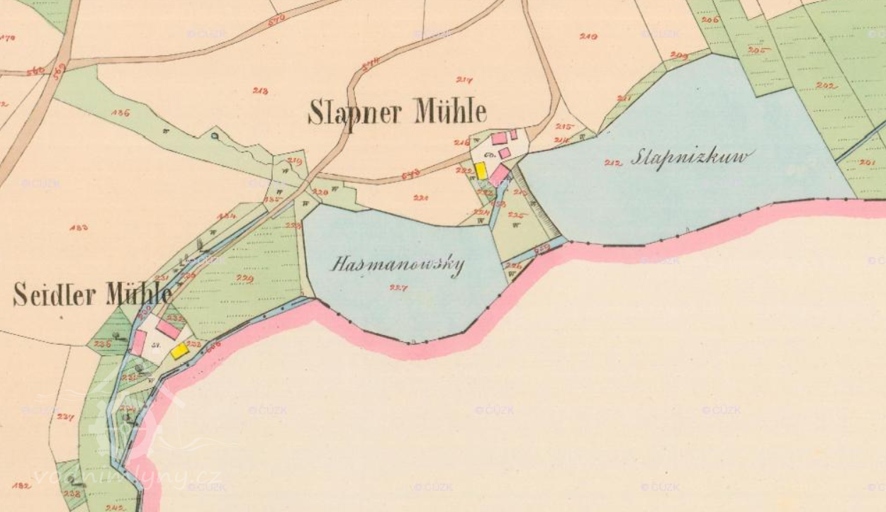 Šlapničkův rybník nad mlýnem dnes vypuštěn a zrušen.