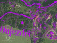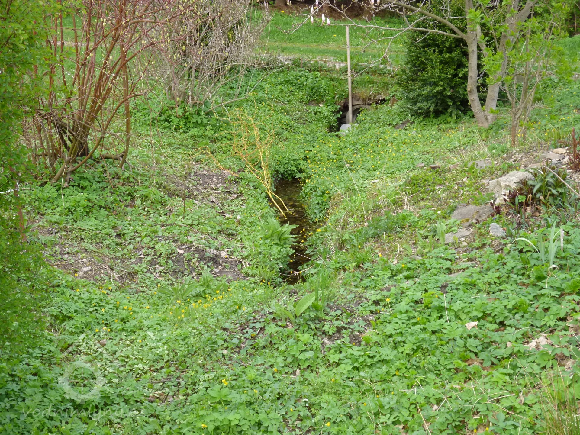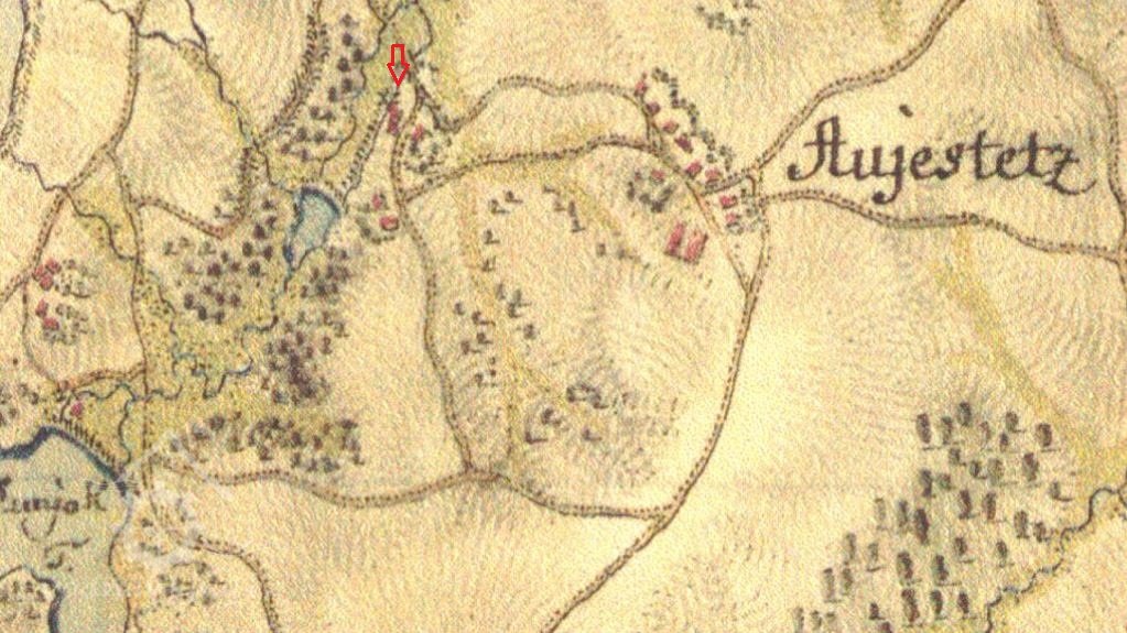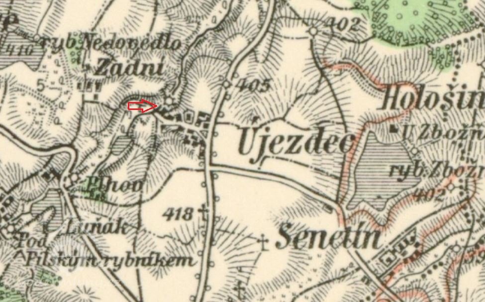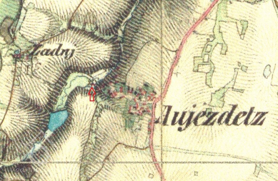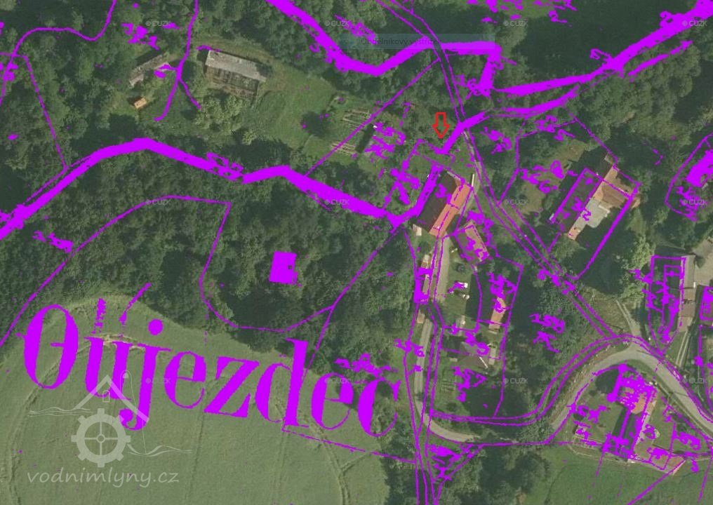 Při východním konci staré hráze jest 39 cm ve světlosti veliká kulatá dřevěná roura kterou se pouští voda do strouhy která vede vodu na mlýn a pilu Františka Růžičky u domu 13 v Oujezdci.