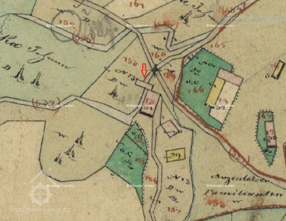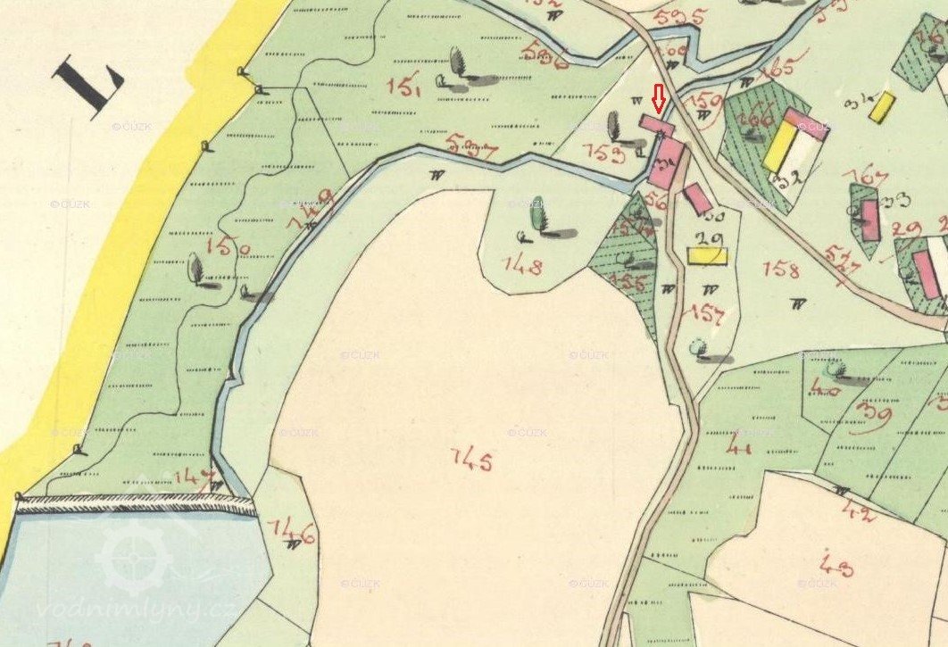 V roce 1838 byl dle stabilního katastru majitelem Jan Růžička. Ke mlýnu čp. 13 patřil také rybník a většina okolních pozemků podél náhonu až k rybníku. Rodině Růžičkových patřila i vedlejší usedlost čp. 14.