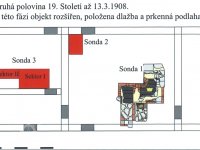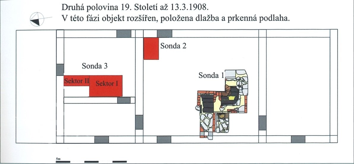 1) od konce 17. stol. do konce 18 stol. - roubený objekt na kamenné podezdívce s trojdílným dělením o rozm. 6,5 x 21-22 m