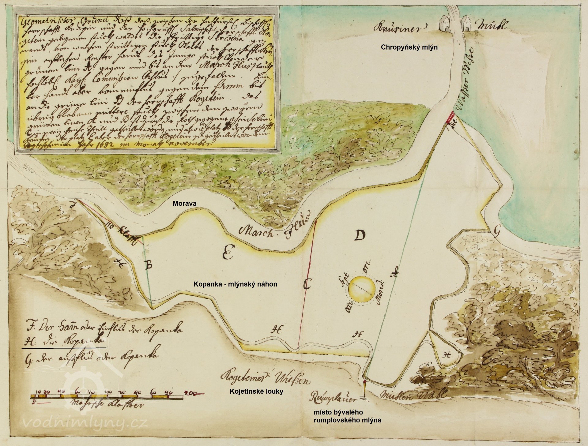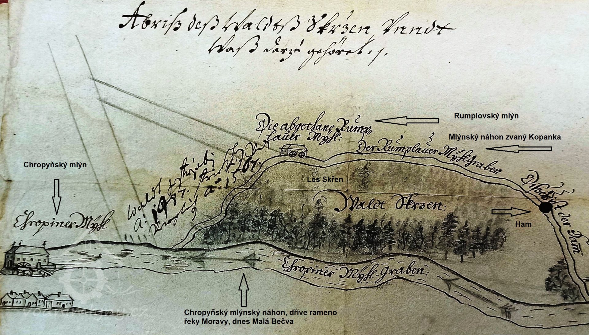 K mlýnu byla voda vedena přes ham uměle vytvořenou strouhou dlouhou přes jeden kilometr, zvanou Kopanka, z levého ramene řeky Moravy, nyní zvané Malá Bečva.