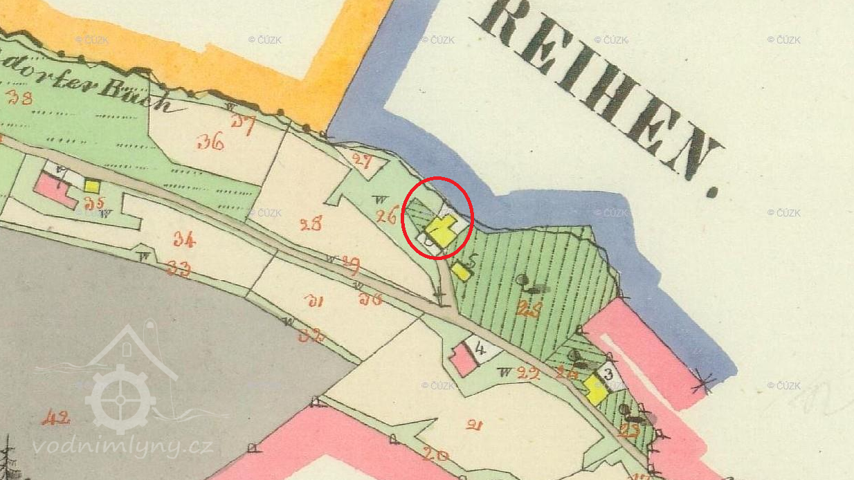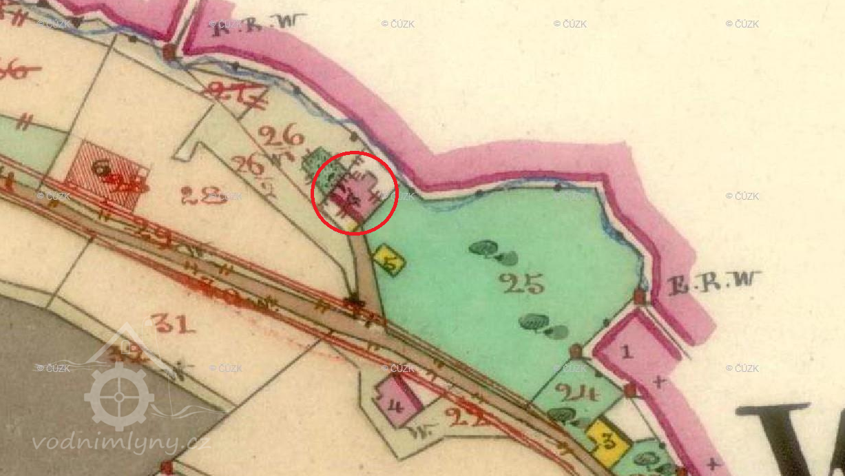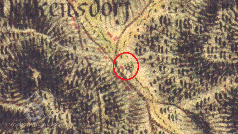 Zaniklý mlýn, který vyhořel začátkem 20. století.
