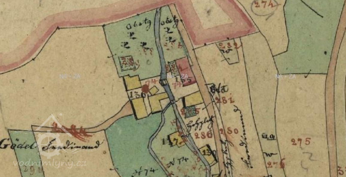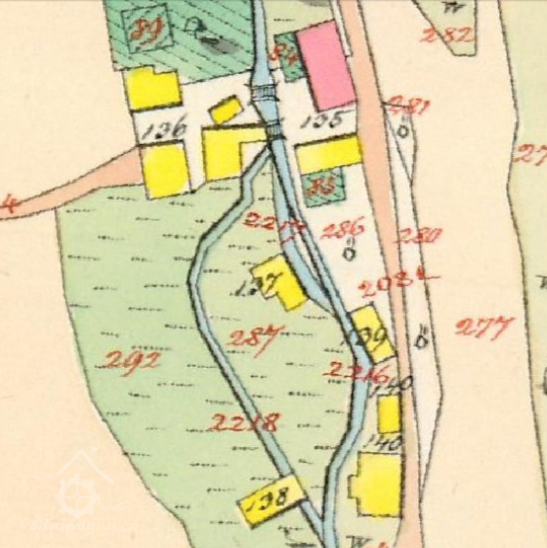 Popis1930 hospodářství: 1 kolo na svrchní vodu, hltnost 0,13 m3/s, spád 2,6 m, výkon 3 HP