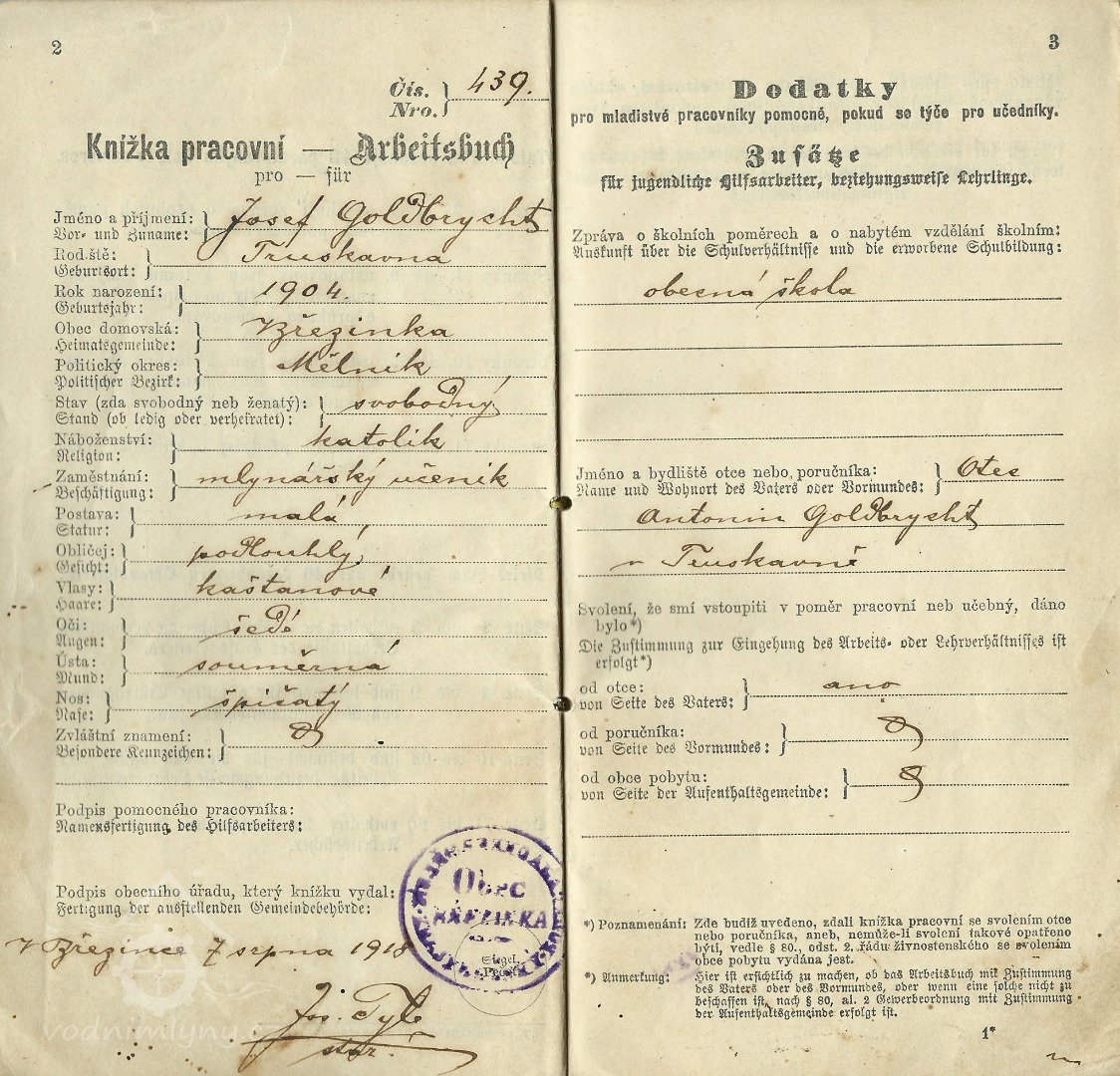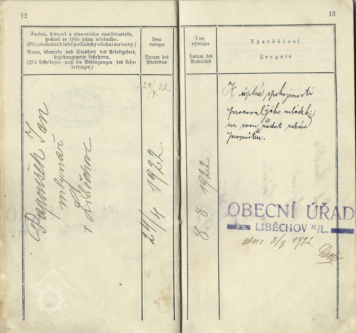 nájemce Jan Fabián, 1874 přešel na mlýn v Brozanech  u Litoměřic