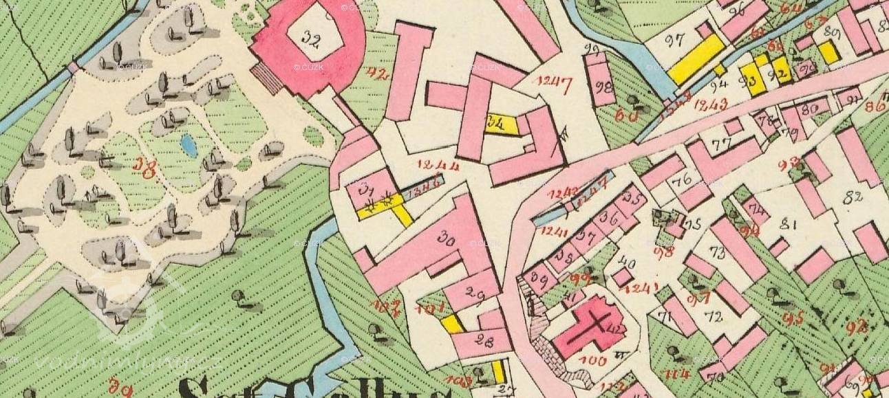 V roce 1621 je zmiňován u zámku mlýn a dvůr. Stavební úpravy se uskutečnily za Kašpara Belvice, který nechal přistavět ovčín, pivovar, mlýn a poplužní dvůr