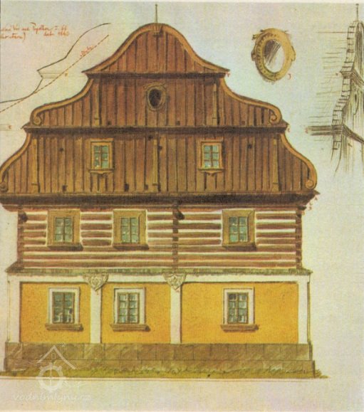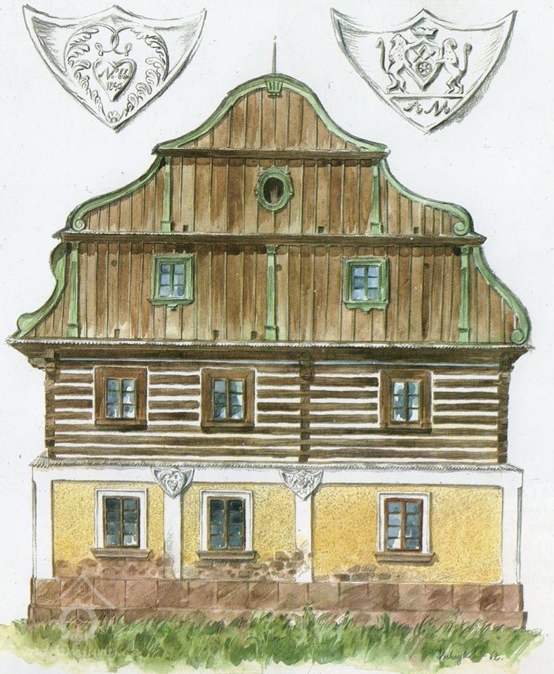 V Průčelí: Trojice oken v přízemi i patře, nesouměrně rozdělena — vlevo 2 okna světnic, vpravo okno komory. Na středních lesenách v hor. části štukové anglické štíty - v jižním mezi 2 ratolestmi srdce a ná­pis A.D./1840; v severním zmizelém písmena AMa dvojice lvů držících štítek s kolem a kovadlinou na štít­ku. Na hl. římse patra nesymetrický dřevěný štít /pův. volutový/,krov kryje pavláčkou na J straně. Svisle bedněný s lištami, dělený 2 římsami /dolní v úrovni zlomu mansardy/; v dolní části 2 osová šestitabulková okénka /viz výše/ s čabrakou pod parapet. deskou, ve střední časti oválné okénko s penízk. ornamentem.