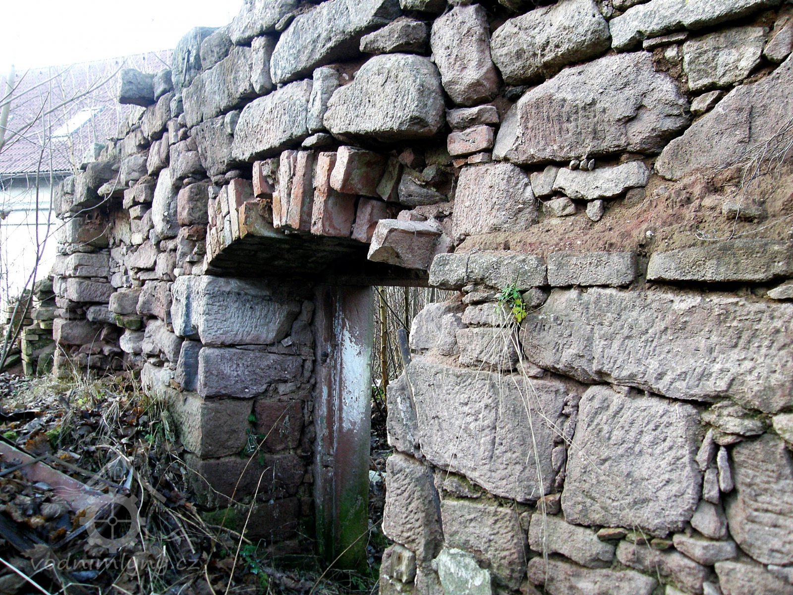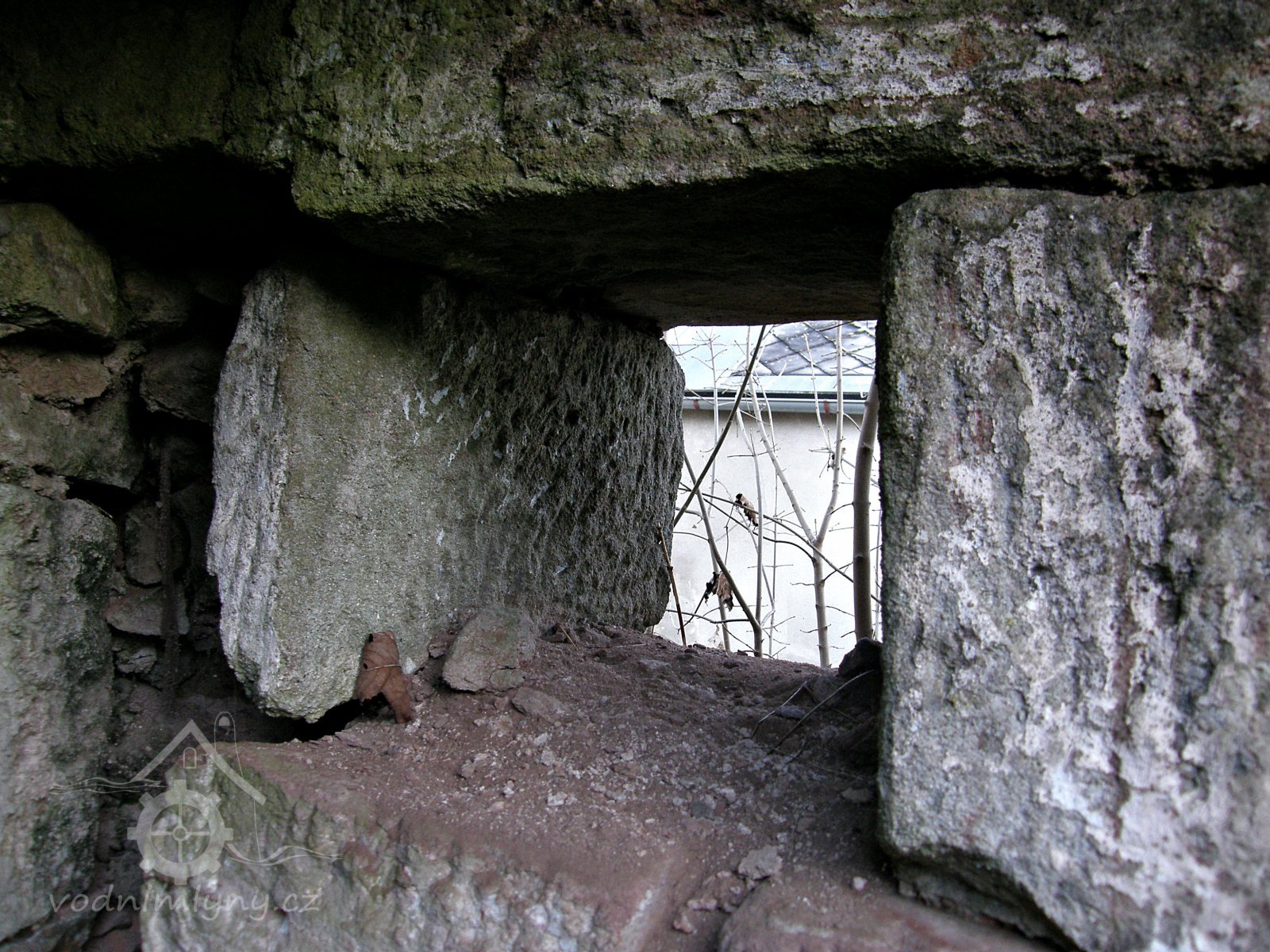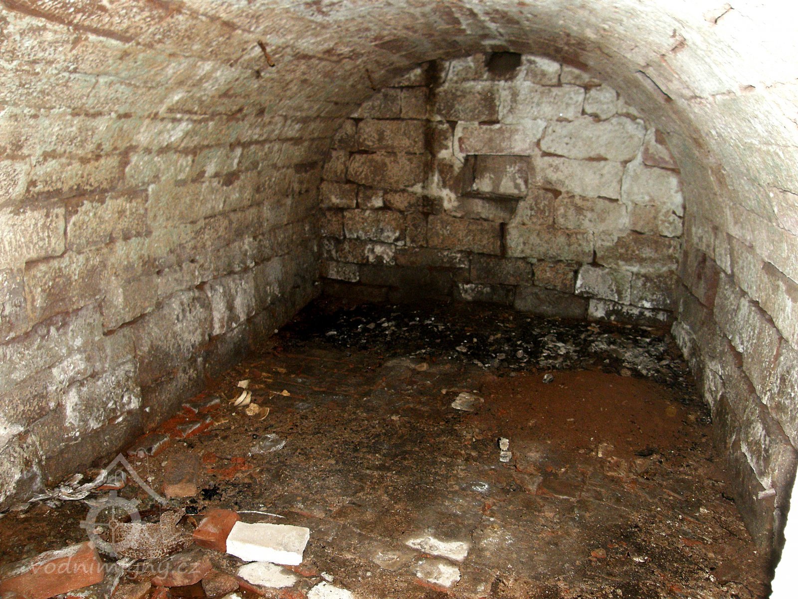 klopeným čelem s pětibokou výsečí nad vchodem. Ve stěně proti vchodu ústí komína, segm. sklenuty výk­lenek a vstup do světnice. Vlevo vstup do světničky se zříceným plochám podhledem se zbytky pravoúhlého zrcadla s čtvrtkruh. probranými rohy. Světnice s část. zříc. podhledem, vpravo mezi 2 segment. výk­lenky vstup do chodby. Chodba plochostropá se zadními dveřmi, strmým dřev. schodnicovým schodištěm při V stěně s odstraněnou Z stěnou /příčka k mlýnici/,ve V stěně vstup do síně, v S stěně šikmý vstup do sklípku. Sklípek vysunutý ven z půdorysu, valené sklenutý na obdél. půdorysu. Mlýnice v JZ nároží - dř. podhled z prken na sráz, částečně zřícený. V SZ nároží úzká prostora nad turbínou a odpadní šachtou, u S stěny betonová šachta přívodu k turbíně.