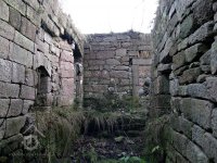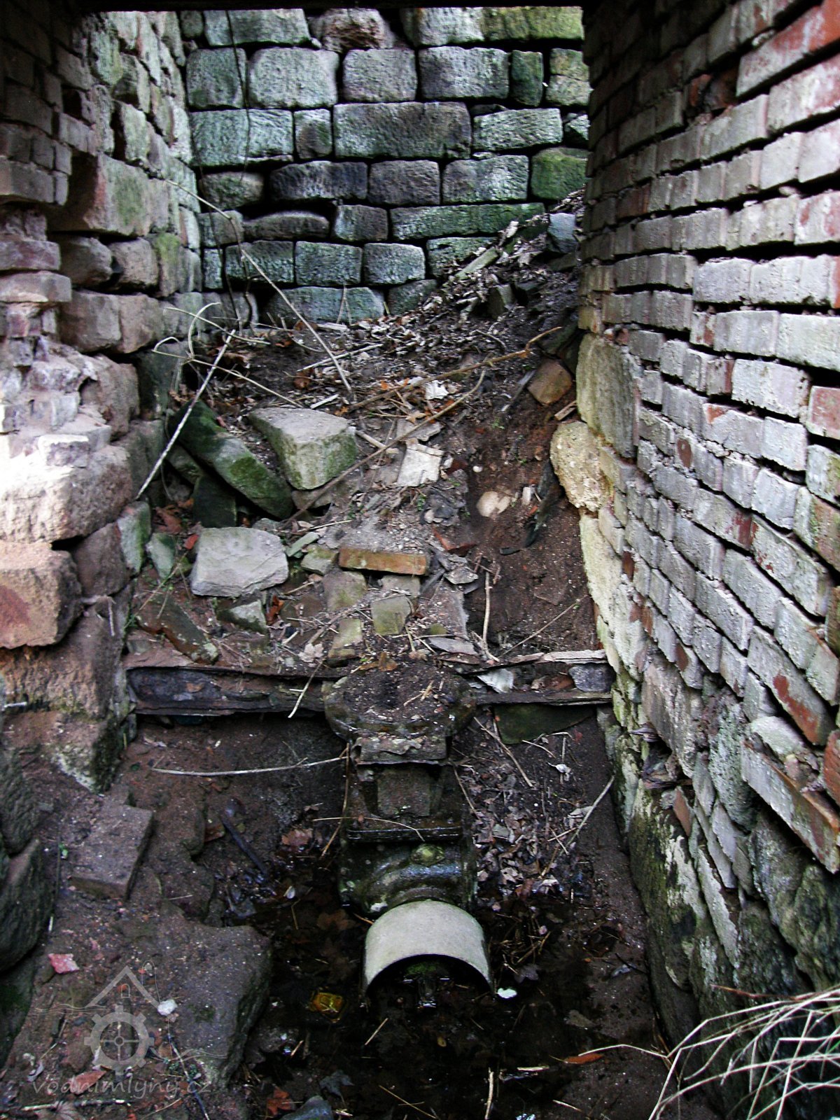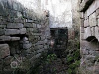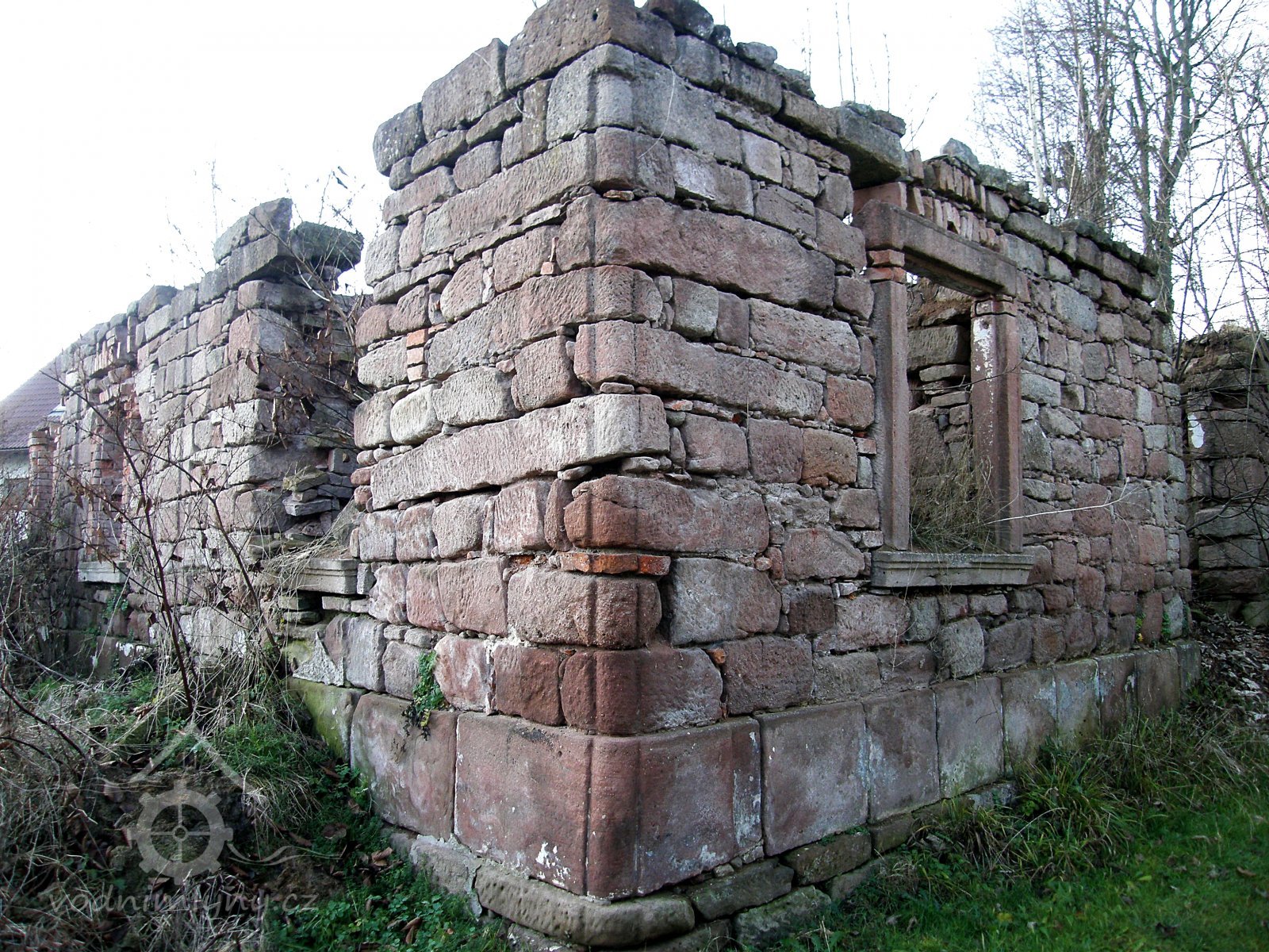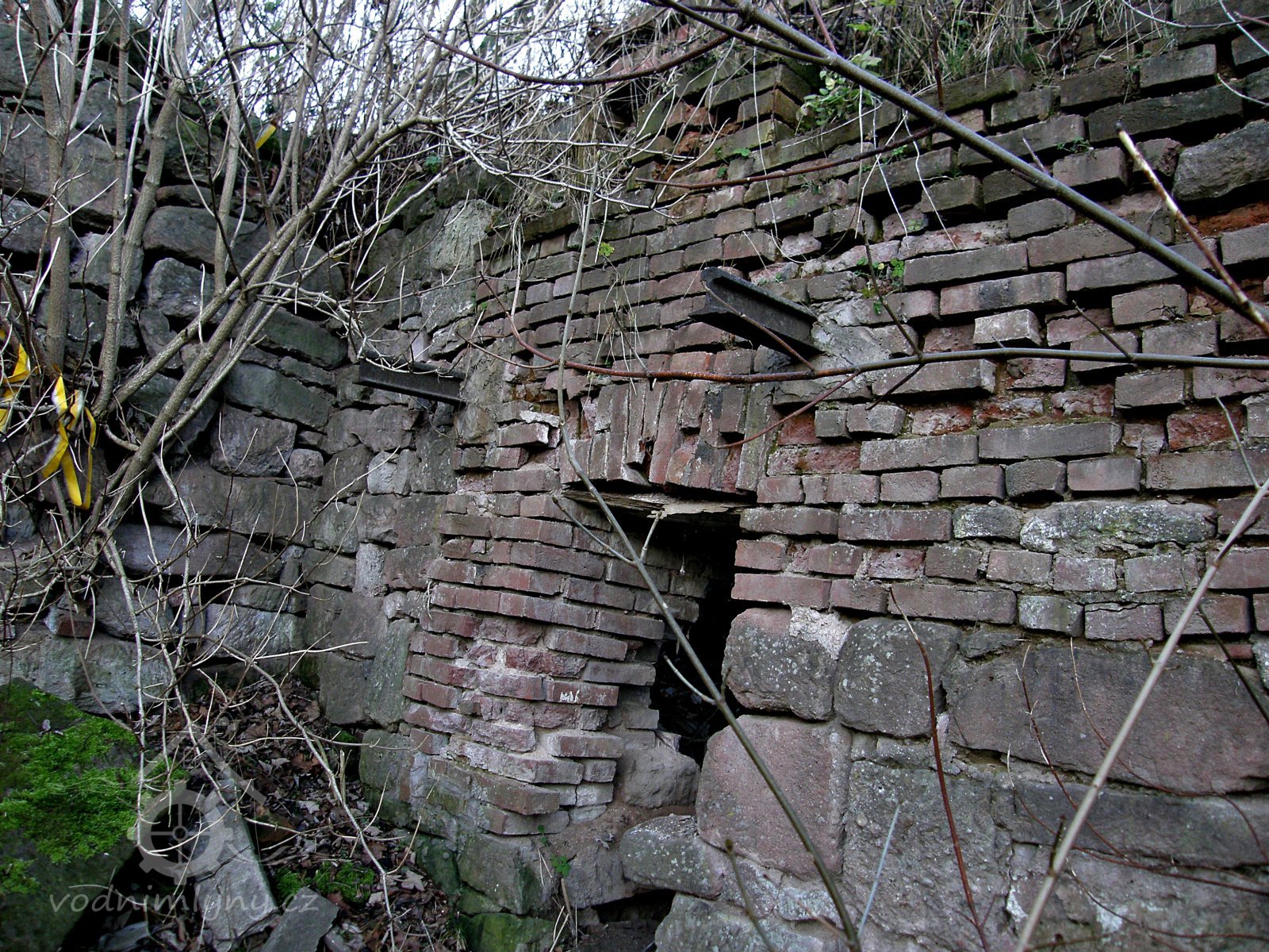 klopeným čelem s pětibokou výsečí nad vchodem. Ve stěně proti vchodu ústí komína, segm. sklenuty výk­lenek a vstup do světnice. Vlevo vstup do světničky se zříceným plochám podhledem se zbytky pravoúhlého zrcadla s čtvrtkruh. probranými rohy. Světnice s část. zříc. podhledem, vpravo mezi 2 segment. výk­lenky vstup do chodby. Chodba plochostropá se zadními dveřmi, strmým dřev. schodnicovým schodištěm při V stěně s odstraněnou Z stěnou /příčka k mlýnici/,ve V stěně vstup do síně, v S stěně šikmý vstup do sklípku. Sklípek vysunutý ven z půdorysu, valené sklenutý na obdél. půdorysu. Mlýnice v JZ nároží - dř. podhled z prken na sráz, částečně zřícený. V SZ nároží úzká prostora nad turbínou a odpadní šachtou, u S stěny betonová šachta přívodu k turbíně.
