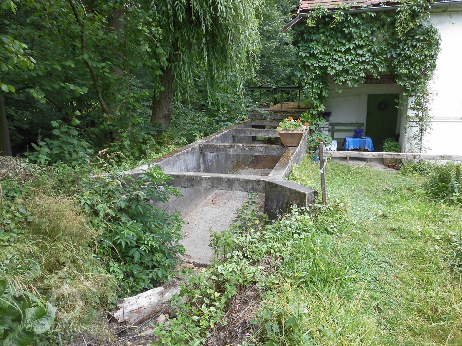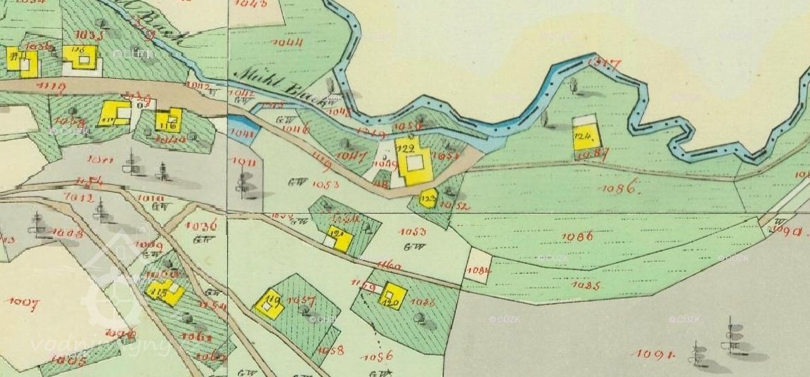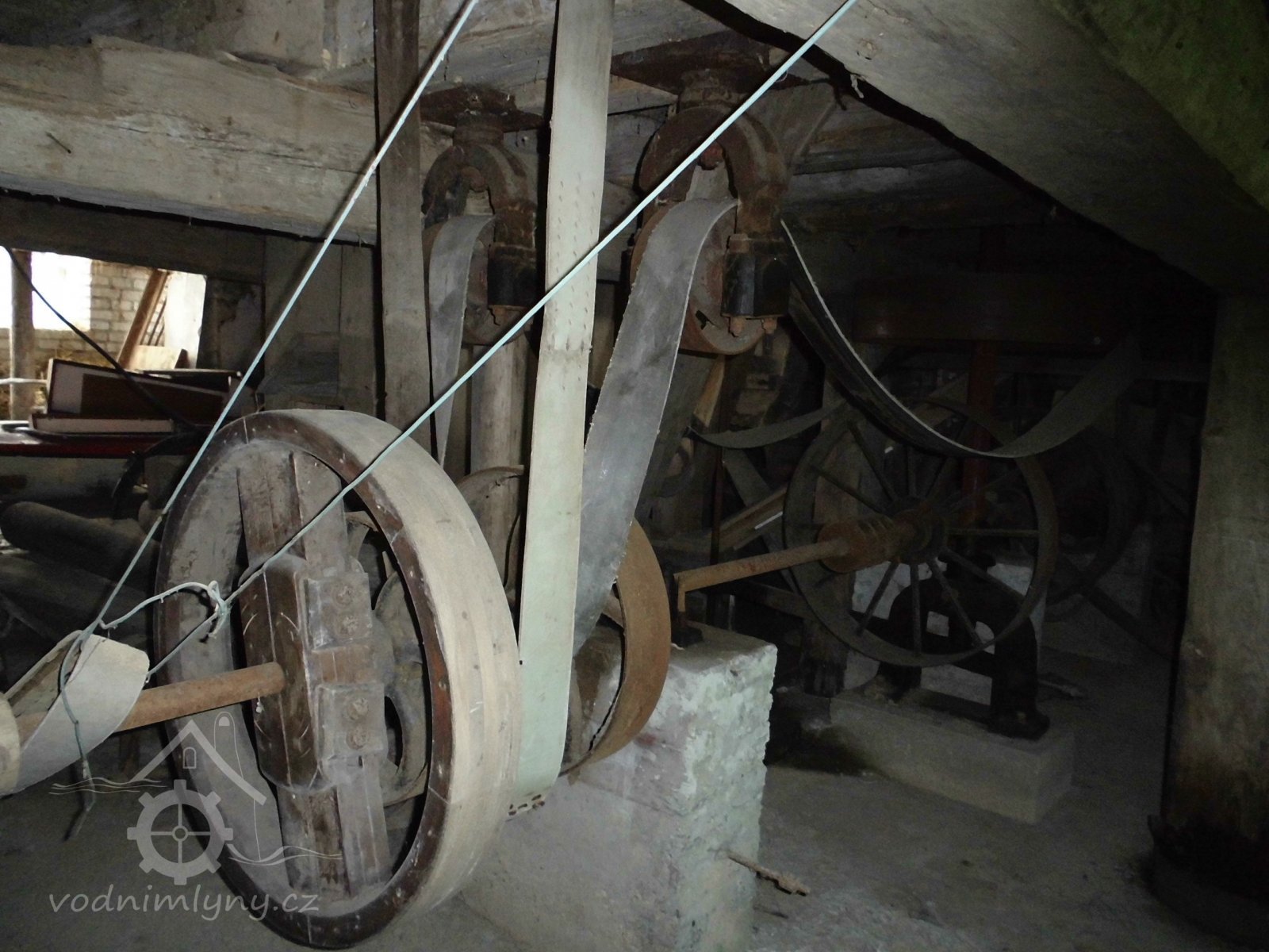 PopisZ údaje ve Vodní knize k roku 1876 víme, o dvou vodních kolech na vrchní vodu s nevelkými průměry 2,4 a 2 m k pohonu dvou mlecích (obyčejných) složení.