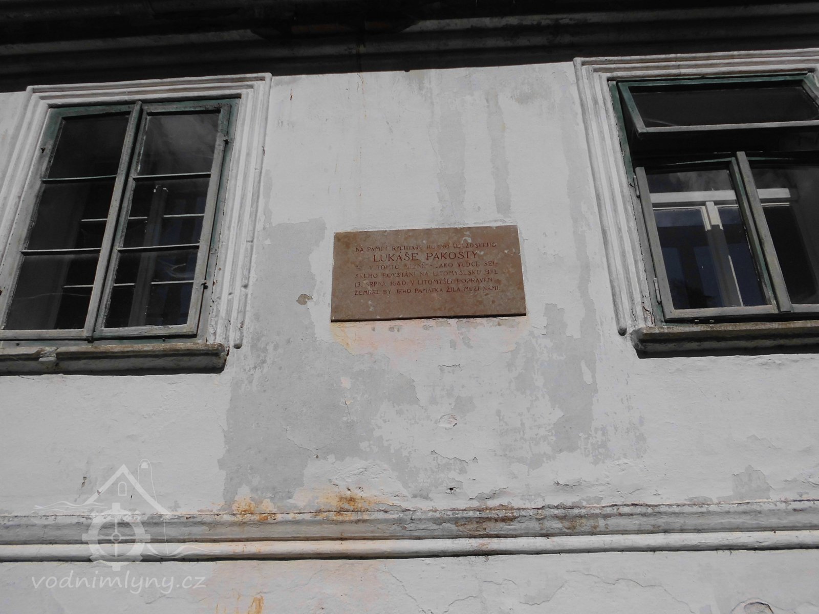 „Na paměť rychtáře horno-újezdského Lukáše Pakosty. Žil v tomto mlýně. Jako vůdce povstání na Litomyšlsku byl 11. srpna 1680 v Litomyšli popraven. Zemřel by jeho památka žila mezi námi.“