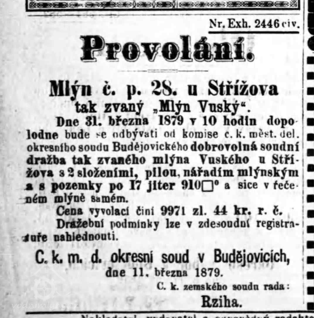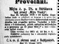 V roce 1879 mlýn změnil majitele po dobrovolné soudní dražbě.
