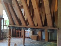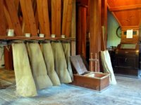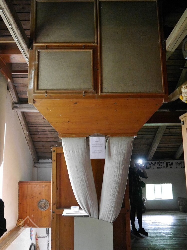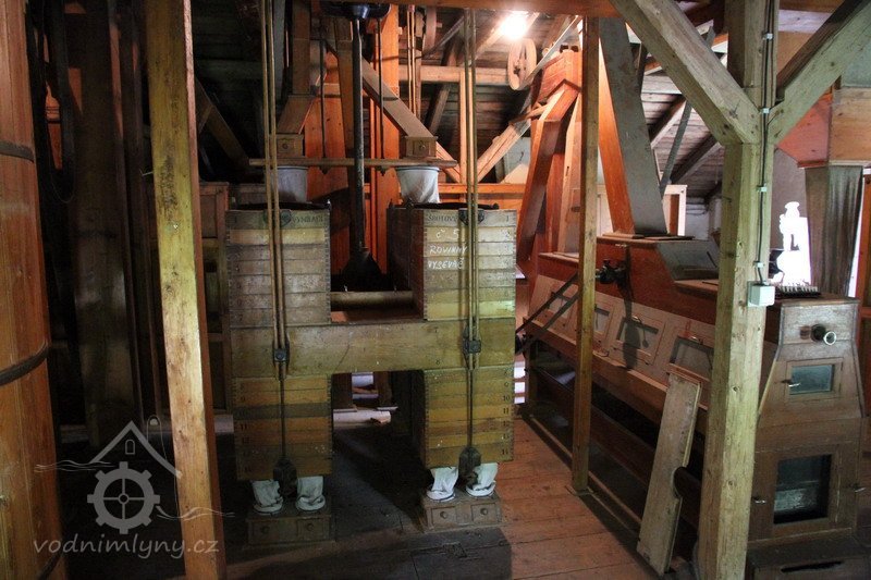 Pohled od patra mlýnice, 07 2025, © Turistický portál Královéhradeckého kraje, (Prvky na obrázku: pytlovací lávka, zásobník, násypka)