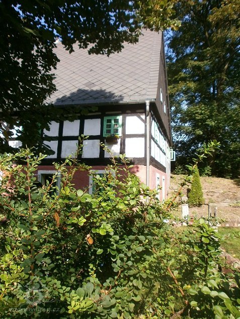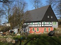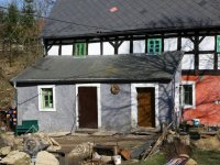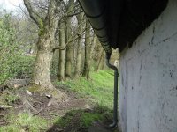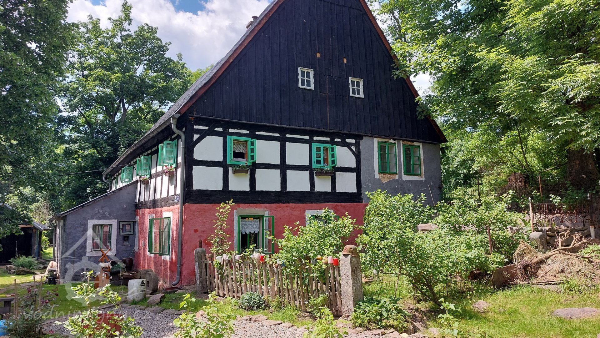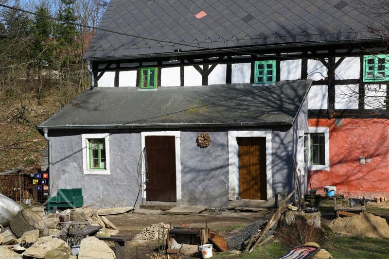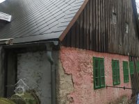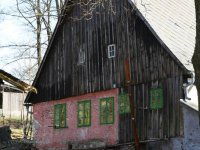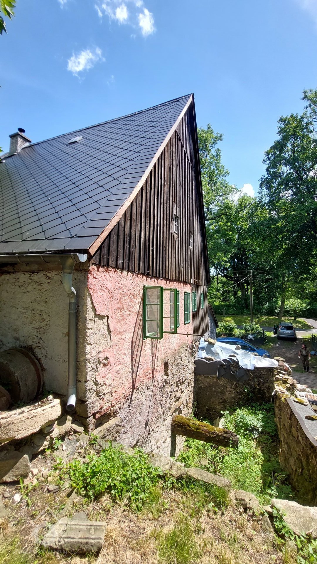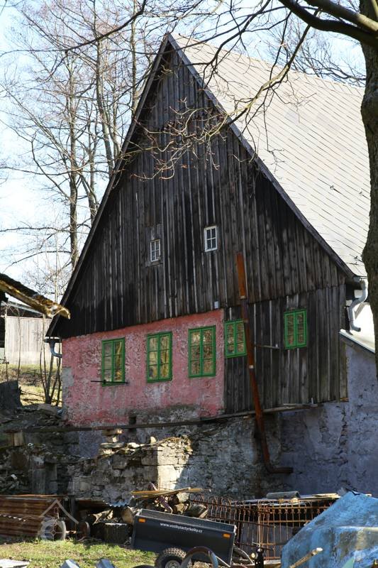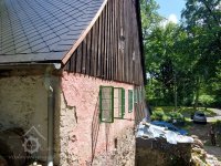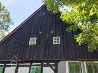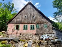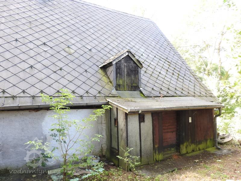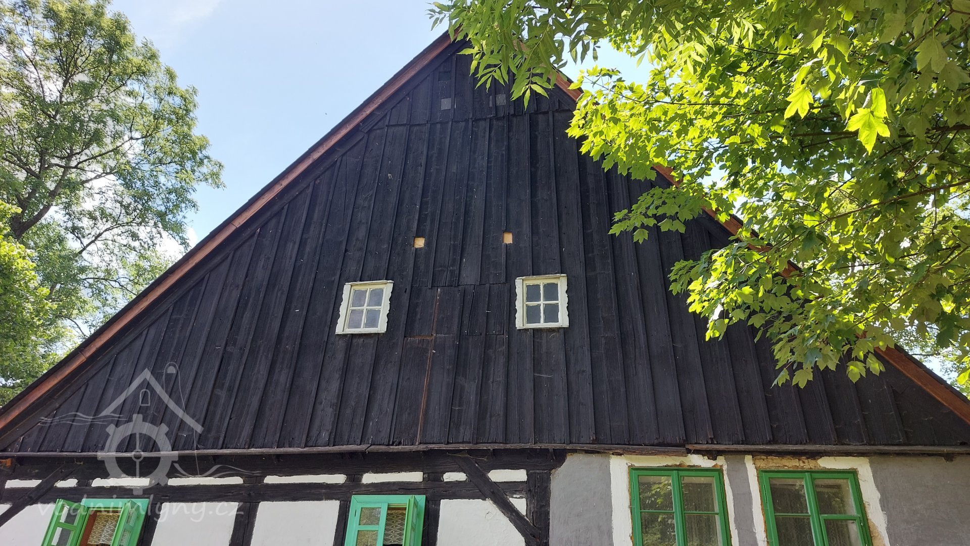 Západní strana mlýna se zbytky lednice, 12.6.2022, © Tomáš Efler, (Prvky na obrázku: okno, skládaný bedněný štít)