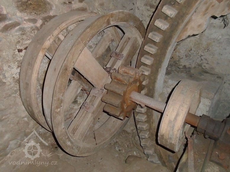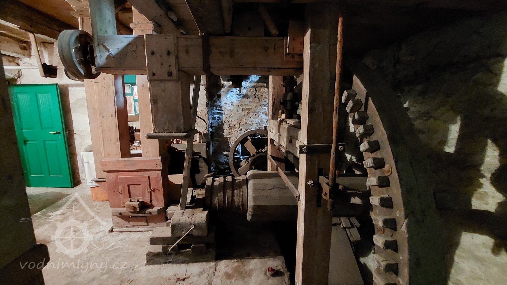Mlýnice - přízemí, 12.6.2022, © Tomáš Efler, (Prvky na obrázku: transmise, řemenice, převody, transmise, řemenice, převody - paleční kola, pastorky a cévníky (řemeslný výrobek), transmise, řemenice, převody - ozubená kola, pastorky (průmyslový výrobek))