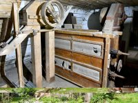 Mlýnice - III. podlaží, 16.6.2022, © Josef Tymonek, (Prvky na obrázku: transmise, řemenice, převody - paleční kola, pastorky a cévníky (řemeslný výrobek), vysévač hranolový, šrotovník)