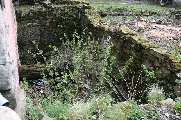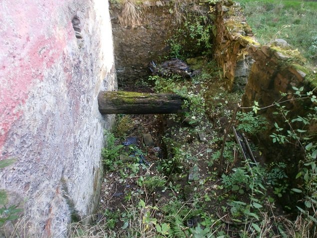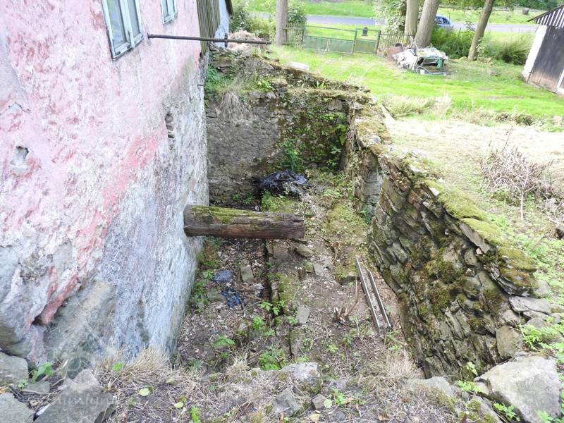 V těchto místech se voda z náhonu dostávala přes vantroky vlevo do lednice, nad mlýnské kolo, 8. 8. 2015, © Renata Šoltová