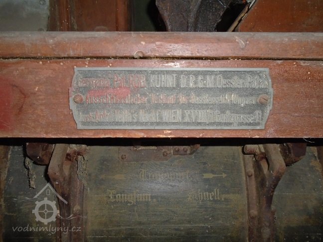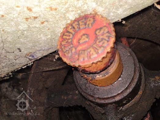 Štítek výrobce, 17.04.2017, © Renata Šoltová, (Prvky na obrázku: válcová stolice, značka výrobce na vodním motoru)