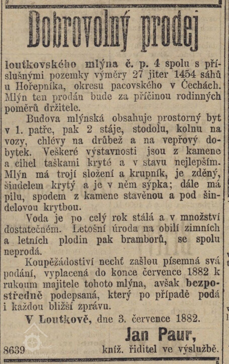 Budova mlýna v Loutkově, místní části Hořepníka na Pelhřimovsku, svítí novotou po nedávné opravě. V soupisu poddaných podle víry z r.1651 loutkovského panství je uveden Jan Pečenka, svobodný mlynář. O jeho technologickém zařízení vypovídají dokumenty uložené v SOkA v Pelhřimově až z roku 1902. Mlýn mlel i za 2. světové války. Další písemné informace se nepodařilo objevit.