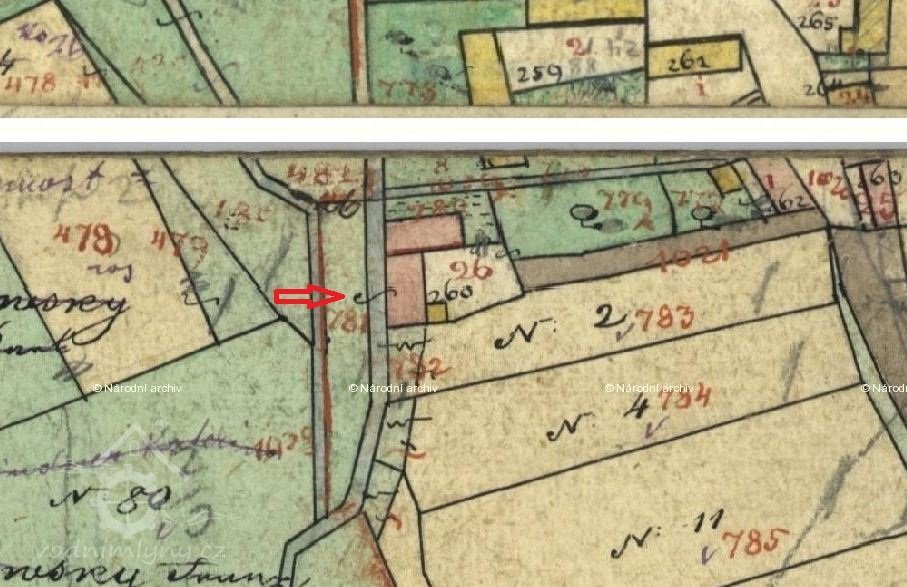 Dle stabilního katastru byl mlýn a okolní pozemky k němu patřící v roce 1842 v majetku obce Zámostí, mlynář byl nájemcem.