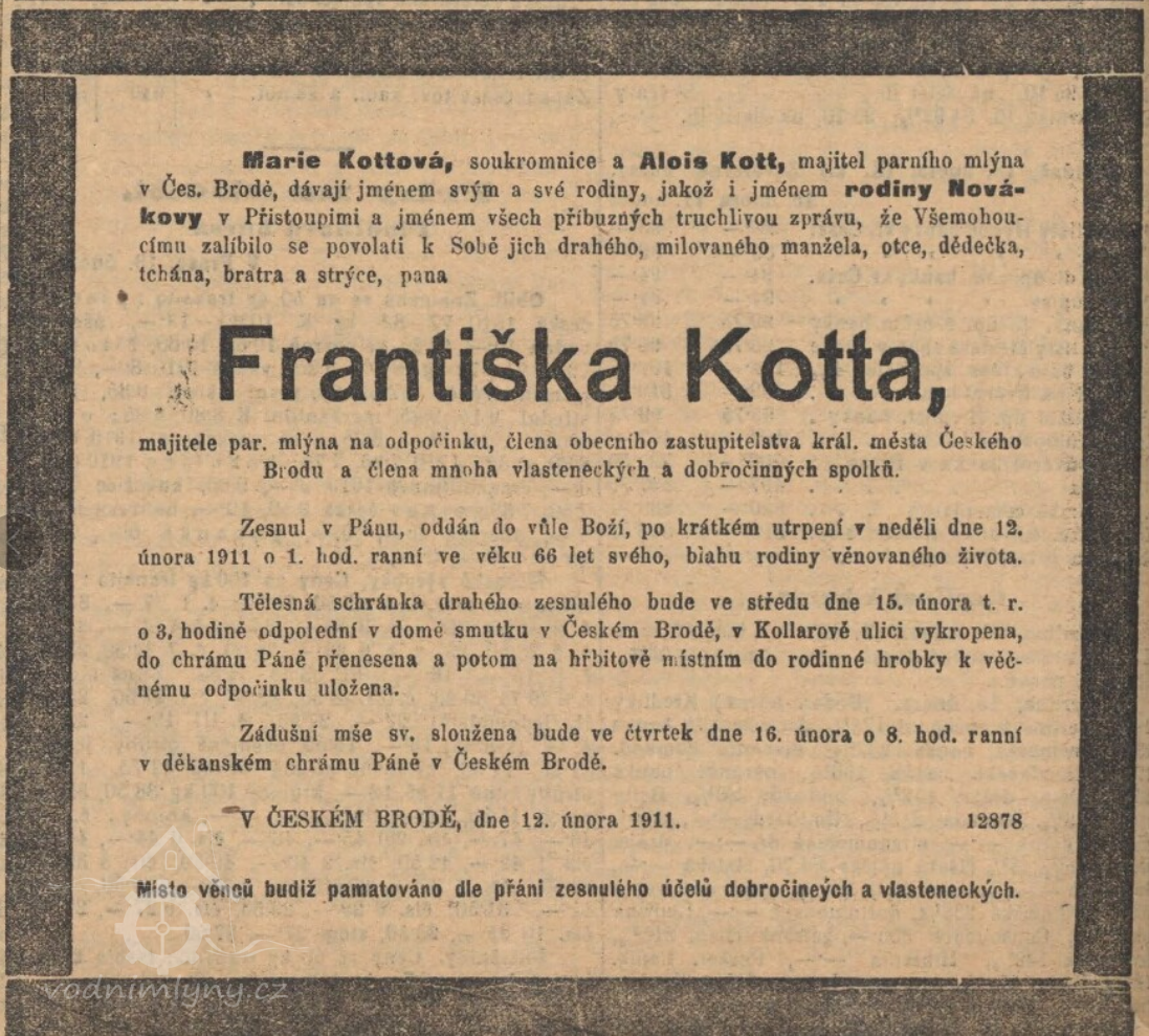 (František Kott zemřel 12. 2. 1911 ve věku 66 let, mlýn měl syn Alois - RR).