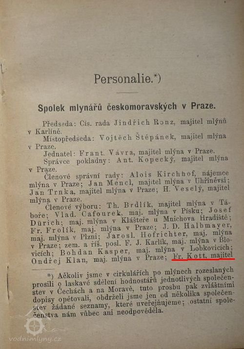 1899 - Fr. Kott členem výboru Spolku mlynářů českomoravských v Praze, členem správního výboru družstva mlynářů v Čechách (Pr, Duška - Kapesní kalendář mlýnů českomoravských - 1899) (HŠ)
