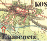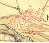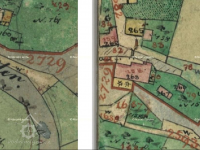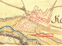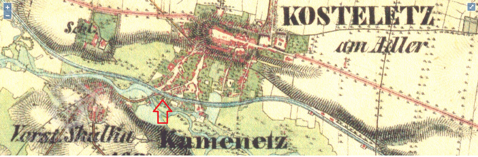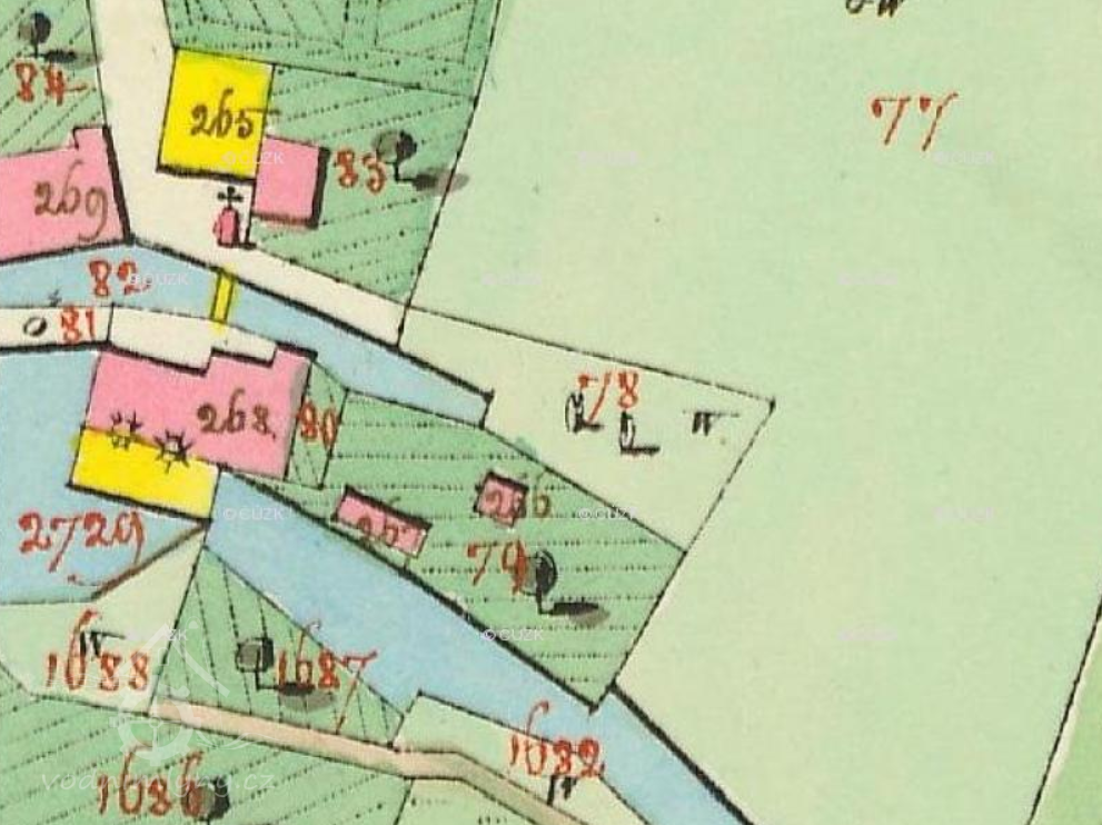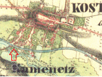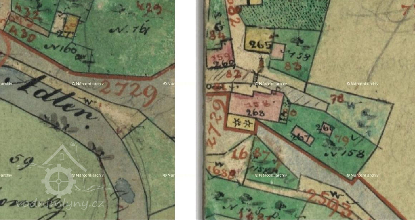 Na 2. voj. mapování omylem zaznačen jiný objekt níže na náhonu - mandlovna a valcha (1871 František Moravec - in Zdrálek, Kamil (ed.) Kostelec nad Orlicí v zrcadle času 2016, II, s. 767). Velký mlýn čp. 158 se nachází východním směrem.