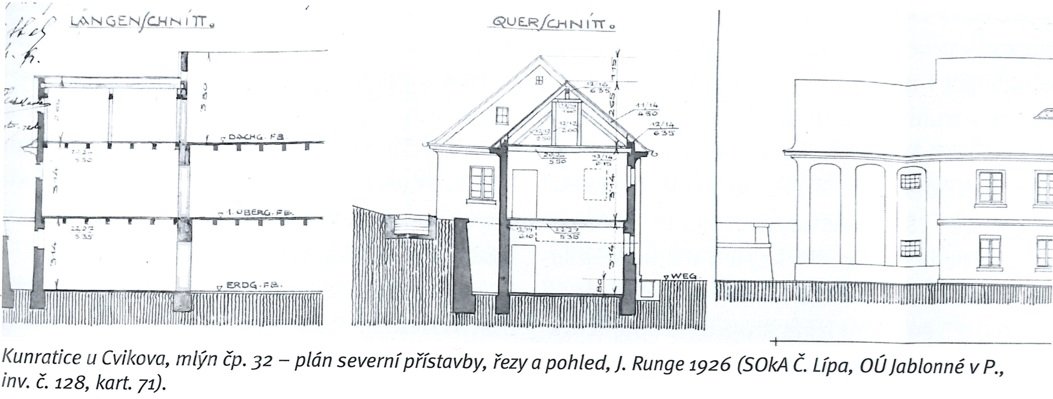 Mlýn mlýna spadá do období rozšiřování soustavy mlýnu na zákupském panství v roce 1727. Byl vystavěn na místě staršího selského gruntu. Pro odlišení od staršího mlýna v obci čp. 61 byl vzhledem ke své poloze na toku Svitávky nazýván „Horní“. Mleči v Kunraticích se dělili mezi oba mlýny. Mlýn zpočátku disponoval jen jedním mlecím složením a platilo se z něj 8 zl. na vykrmování vepřů a v naturáliích 2 strychy pšenice a 16 strychů žita. Stavebníkem mlýna byl Anton Bradl, který ho v roce 1737 prodal Johannu Frantzovi Bradlovi, pilaři ze Cvikova, za 500 zl. Po něm zde hospodařil jeho syn Josef, který za mlýn zaplatil 1000 zl. (Tehdy je uveden i inventář - mj. truhly, 4 oškrdy a měrné nádoby na mouku a obilí.)