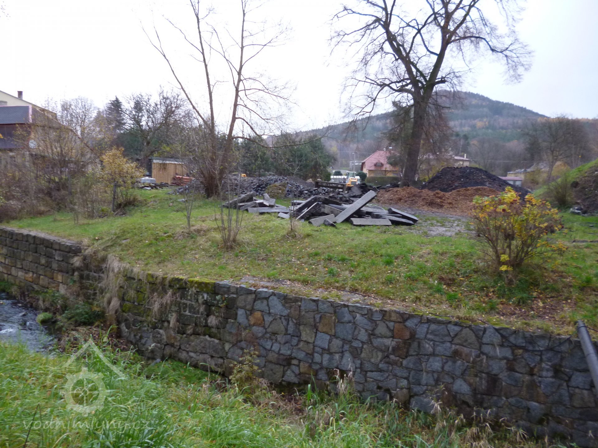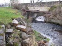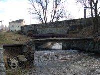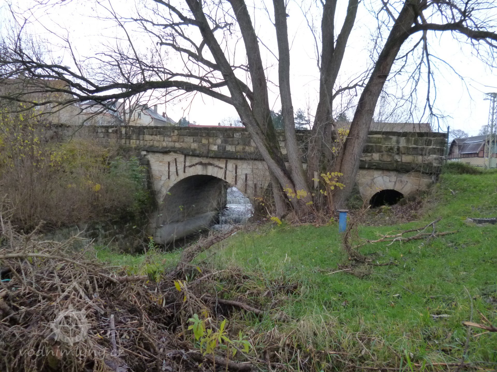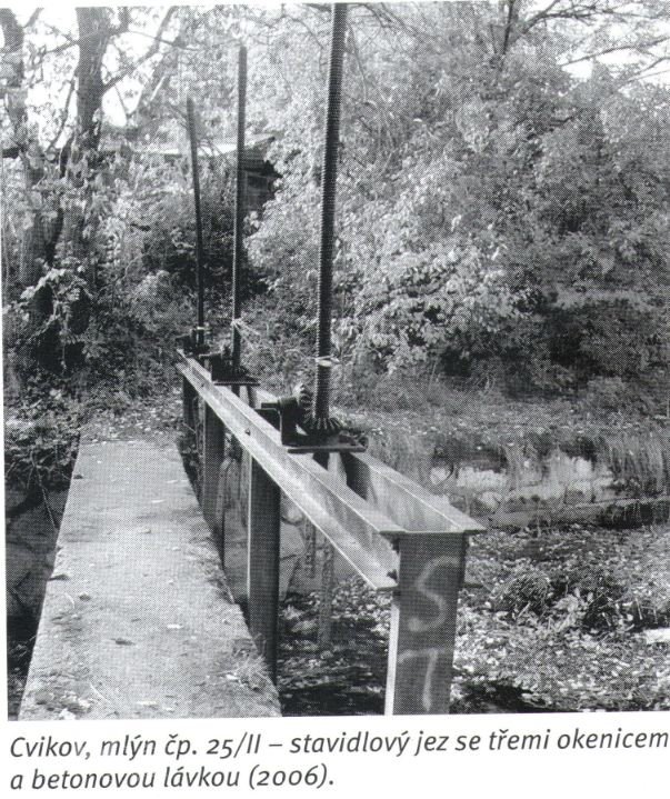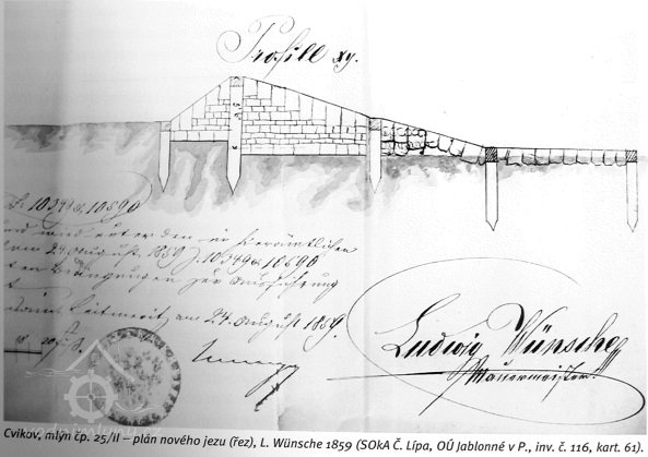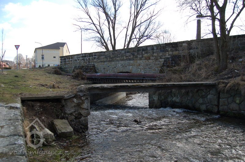 1854 při povodni stržen jez, po námitkách ze strany výše položeného mlýna čp. 62/I. nový kamenný přepadový jez vystavěn r. 1860 zhruba na stejném místě těsně před mostem. Jez byl veden kolmo a na jeho levém okraji (ve směru po proudu) bylo vpouštěcí stavidlo do náhonu.