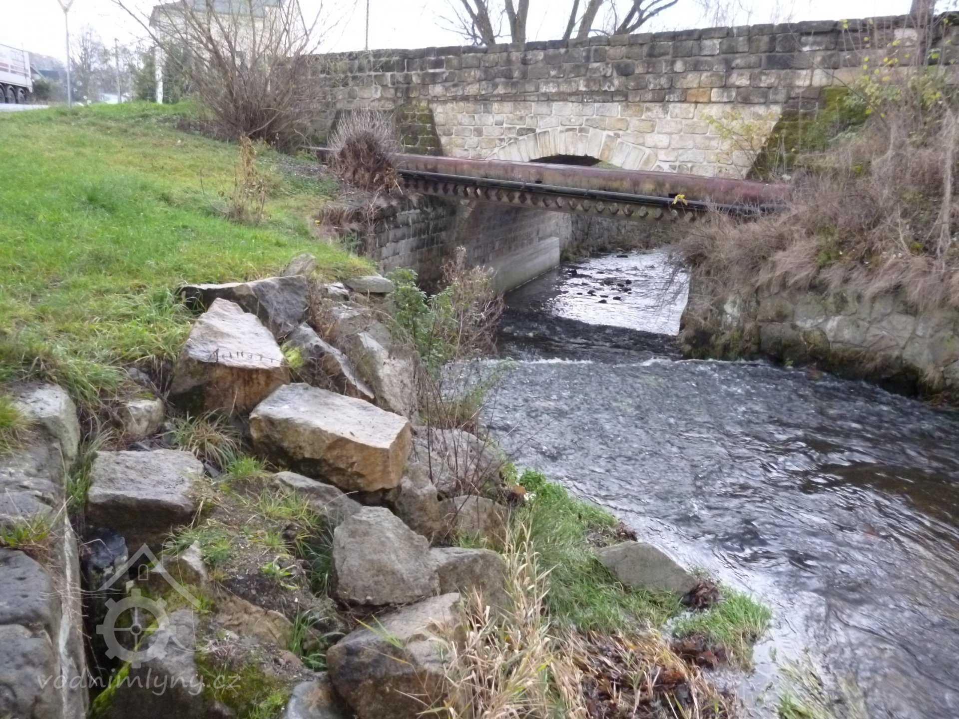 Revize vodního díla 1927-1928 a 1934-1935: Náhon začínal u jezu u mostu z let 1845-1846 přes Pivovarskou ulici. Jez měl korunu o délce 6,65 m, byl stavidlový s dřevěnou sráznou podlahou o délce cca 25 m, do roku 2006 byl opatřen trojicí kovových rámů a betonovou manipulační lávkou. Práh jezu je vyzděný z velkých kamenných bloků. Na levém okraji jezu byl začátek náhonu, náhon pak procházel propustkem v mostu a pokračoval dál souběžně s levým břehem potoka. Vpouštěcí stavidlo náhonu mělo šířku 0,97 m a výšku 0,7 m. Náhon měl až po vantroky délku 120,5 m, šířku 1,3 m, výšku 1 m a spád 1,06 %. Dřevěné vantroky měly délku 10,15 m, šířku 1,48 m a hloubku 0,47 m. Nátok na kolo zajišťovala vpouštěcí klapka o rozměrech 0,58 x 1,25 m. Z vantrok padala voda na vodní kolo na vrchní vodu o průměru 4,8 m a šířce 1,535 m. Klenutý odtok od mlýna měl délku 74,5 m a profil 1,5 x 1,5 m, ústil do potoka mezi domy čp. 22 a 156/II. Boberský potok se dříve nazýval Woberův.