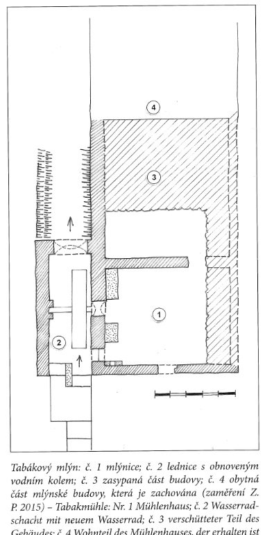 Popis1930 – jedno vodní kolo na spodní vodu, průměr 4,5 m, šíře 100 cm, hltnost 0,44 m3/s, spád 1,2 m, výkon 2,37 HP - funkční vodní kolo na spodní vodu bylo obnoveno v roce 2010.