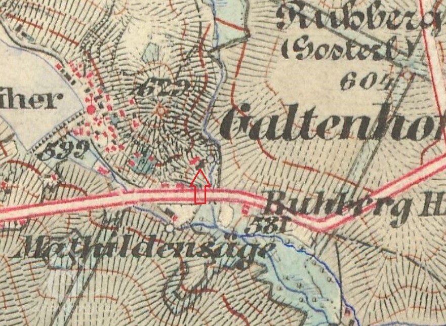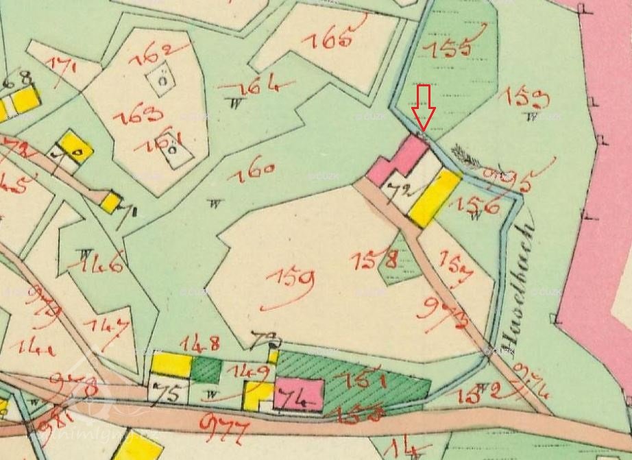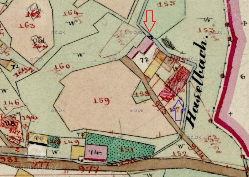 Původní budova Haselmühle je pod tímto označením zakreslena na staré katastrální mapě z roku 1804.