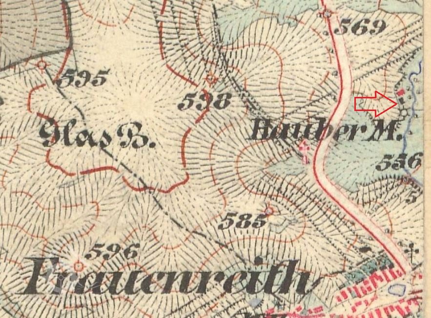 Mlýn postavený přibližně v polovině 19. století stál na levé straně Bílého potoka mezi obcemi Halže a Svobodka, asi 600 m severně od Svobodky (dříve Frauenreith).