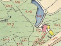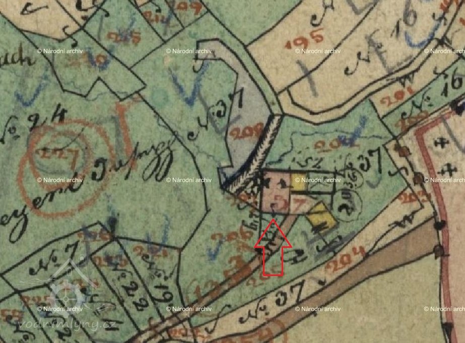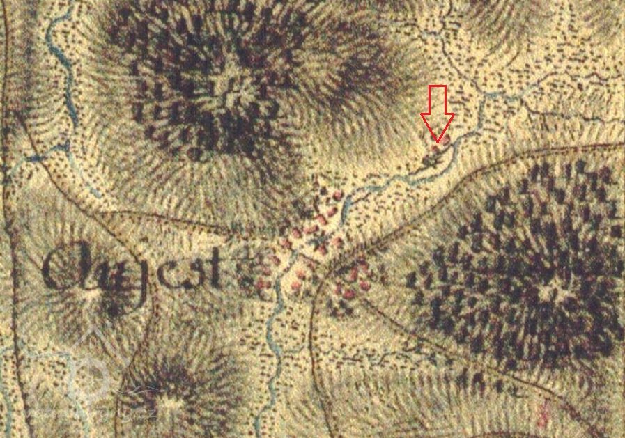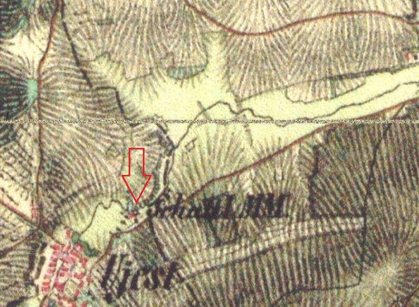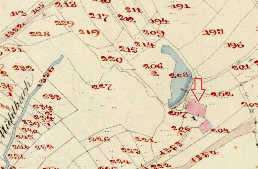 Na mapě stabilního katastru z roku 1838 je mlýn zakreslen jako soubor drobných budov pod čp. 37, z nichž u jedné je zakresleno vodní kolo poháněné z místní vodní nádrže nad mlýnem. V čp. 37 je uveden Franz Gartner.