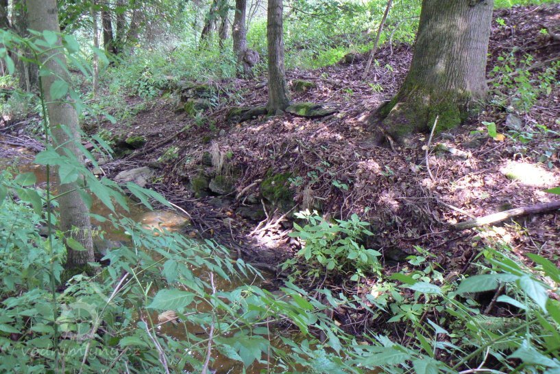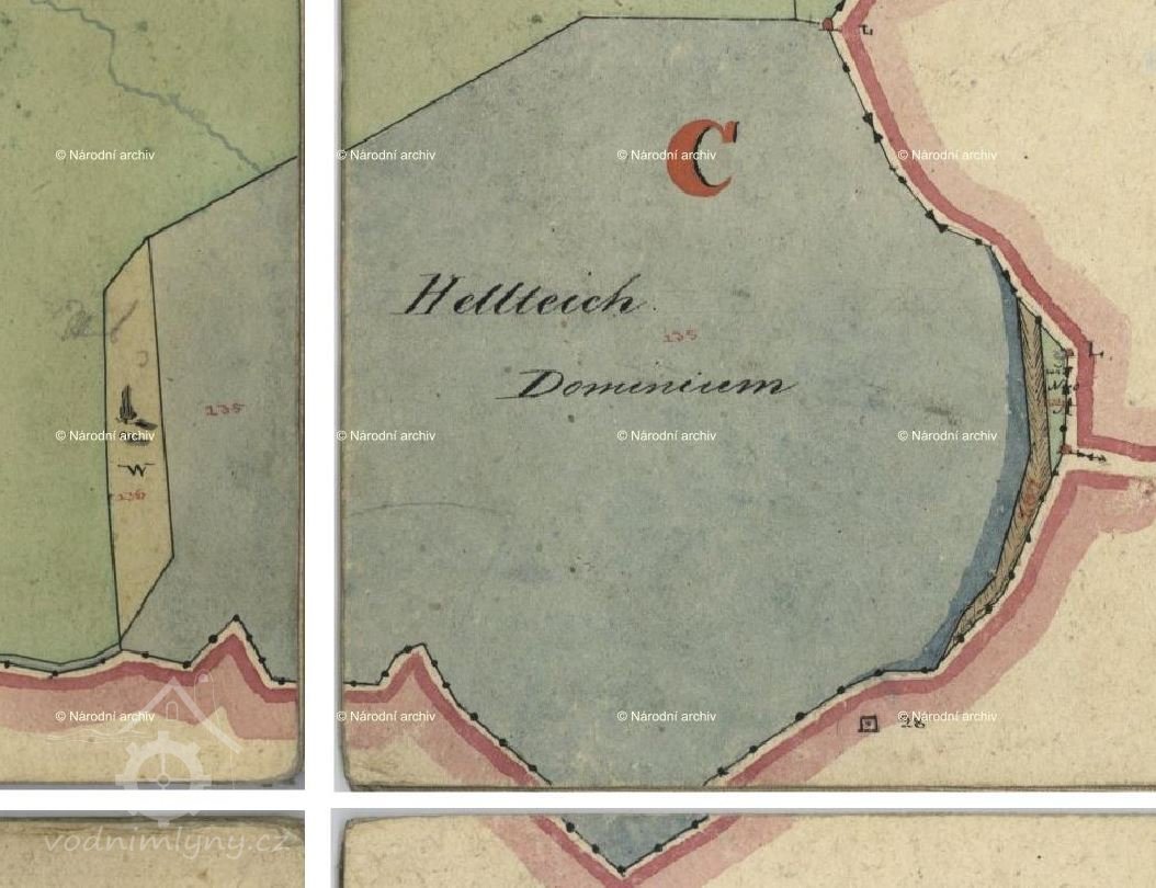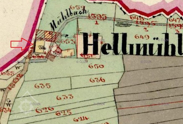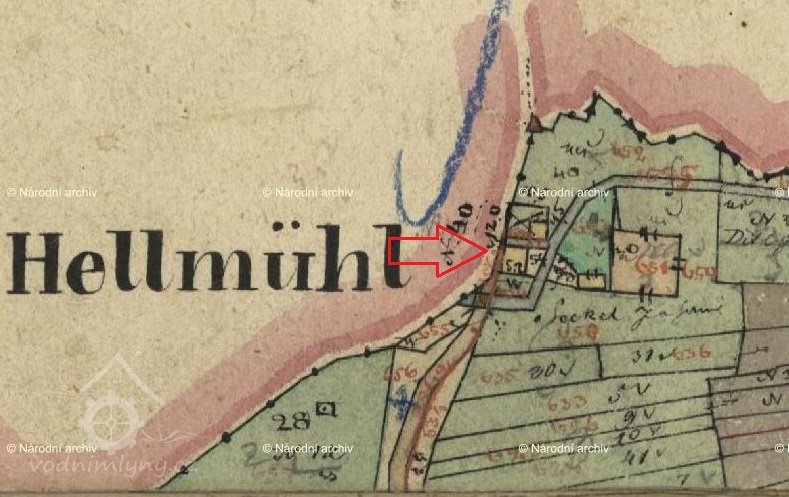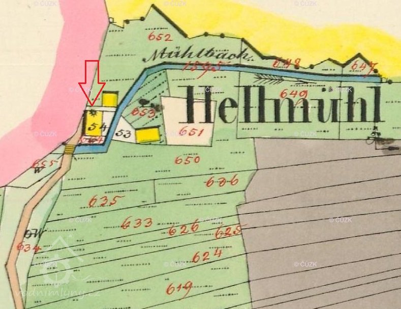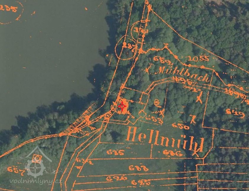 Mlýn stál pod hrází rybníka. Odtokový kanál probíhal pod hospodářskou budovou mlýna.
