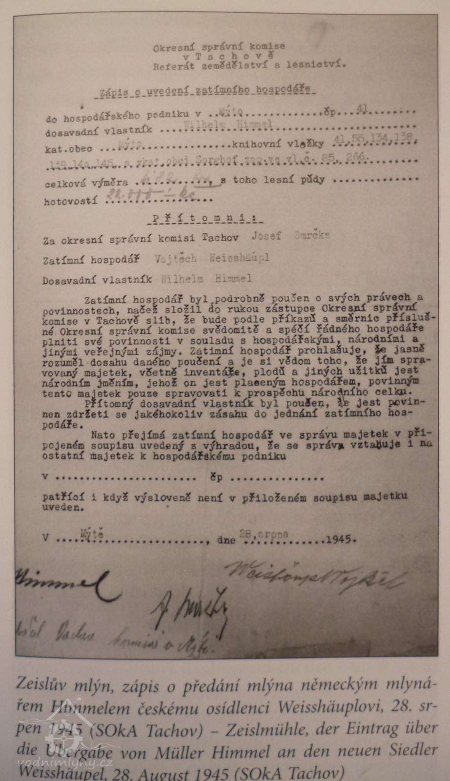 Wilhelm a Marie Himmlovi drželi mlýn až do roku 1945, kdy byli odsunuti do Německa. Národním správcem mlýna byl ustanoven Vojtěch Weisshäupel z Votic na Táborsku. Dochoval se protokol o předání mlýna ze dne 26. 8. 1945 podepsaný majitelem Wilhelmen Himmelem a novým národním správcem Vojtěchem Weisshäuplem. V předávacím protokol je rovněž sepsáno vybavení mlýna i živý inventář. Vojtěch Weisshäupel je protokole uváděn jako stavitel mlýnů Přišel sem i s manželkou Antonií a měl v plánu mlýn provozovat. V roce 1948 však rozhodli komunisté, že tento mlýn bude uzavřen. Nový mlynář proto ze mlýna již v dubnu 1948 odešel. V červnu 1948 požádalo o přidělení opuštěného mlýna Horské pastvinářské družstvo v Písařově Vesci. V žádosti družstevníci sdělují, že ve mlýně chtějí šrotovat krmivo pro dobytek a v obytné části zřídit kancelář. Mlýn však byl krátce nato zbořen.