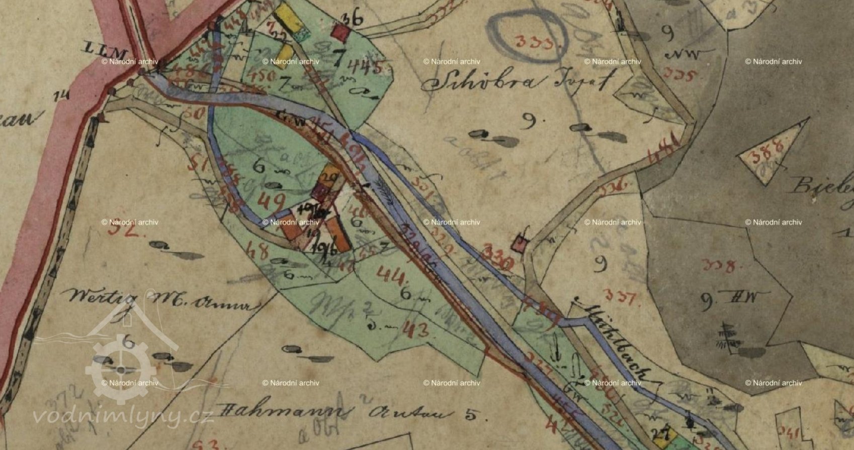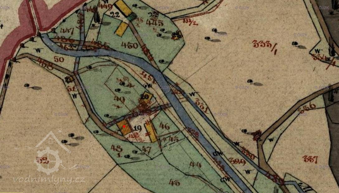 PopisV roce 1930 zde bylo 1 kolo na svrchní vodu, průtok 0,0655 m3/s, spád 5,3m, výkon 3HP
