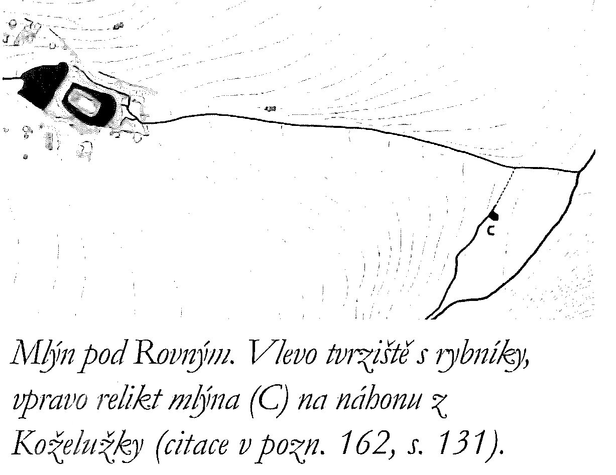 Terénní průzkum potvrdil, že pod rybníkem kolem tvrziště se nalézal další menší rybníček a teprve pod ním ležel mlýn, z něhož zůstal výrazný terasovitý útvar, vybíhající do rybníka. Pravidelné vypouštění horního rybníka k pohonu mlýna by totiž narušovalo obranyschopnost tvrze.