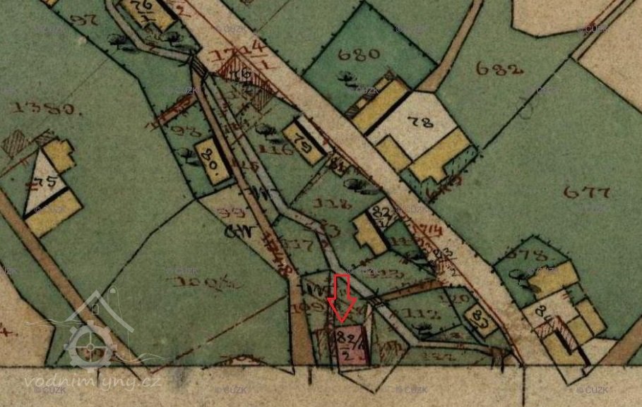 Náhon odbočoval z potoka doleva u domu čp. 126 (dnes ev. č. 55) a vedl podél cesty ke hřbitovu. Nad mlýnem se rozšiřoval do malé akumulační nádržky, ze které tekla voda podél západní strany mlýna. Krátký odtok ústil pod mlýnem u čp. 22 zpět do potoka.