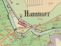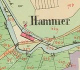 1838 – Skica a otisk stabilního katastru – na náhonu z Radbuzy podlouhlá obdélníková již nespalná budova s jedním kolem a č.p. 22, nedaleko malá zděná budova č.p.23 a malá kaplička. Název Hammer.