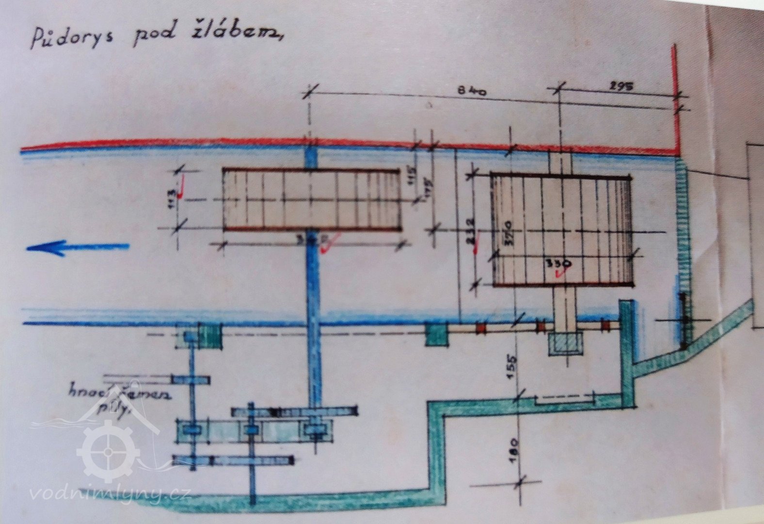 2. (pila, umístěno vpředu): hltnost 0,18 m3/s, spád 4,1 m, výkon 6,25 HP (4,63 kW), prům. 2,7 m, 7 ot./min. (1936: hltnost 160 l/s, hrubý spád 4,2 m, využito 4 m, výkon cca 5 HP)