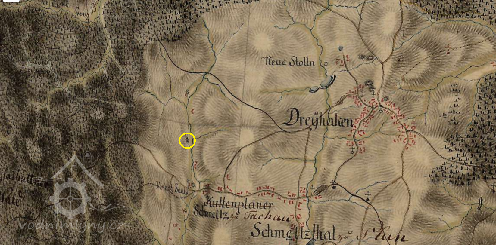 Zaniklý mlýn s pilou a hospodou na samotě.