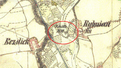 Lodní mlýn se nacházel nedaleko mostu přes Ohři na cestě vedoucí k zámku Rybňany.