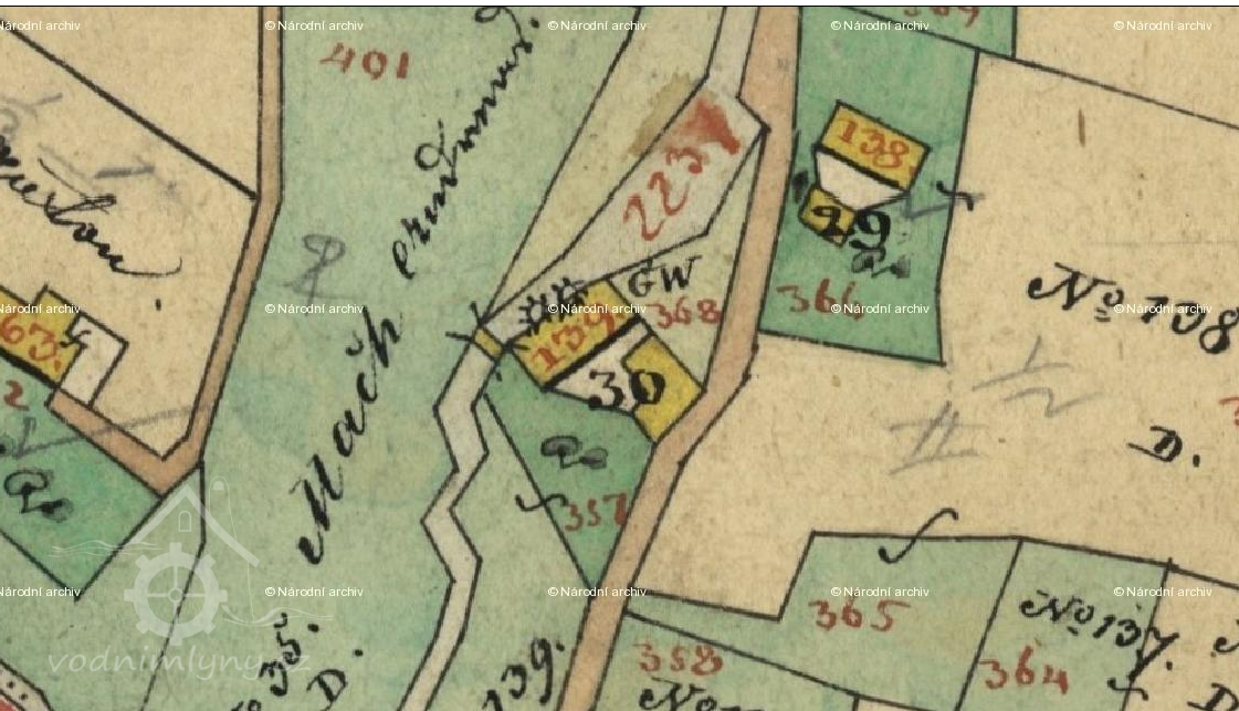 PopisVe mlýně bylo 1 kol na svrchní vodu, průtok 0,063 m3/s, spád 5,4 m, výkon 3,4 m.