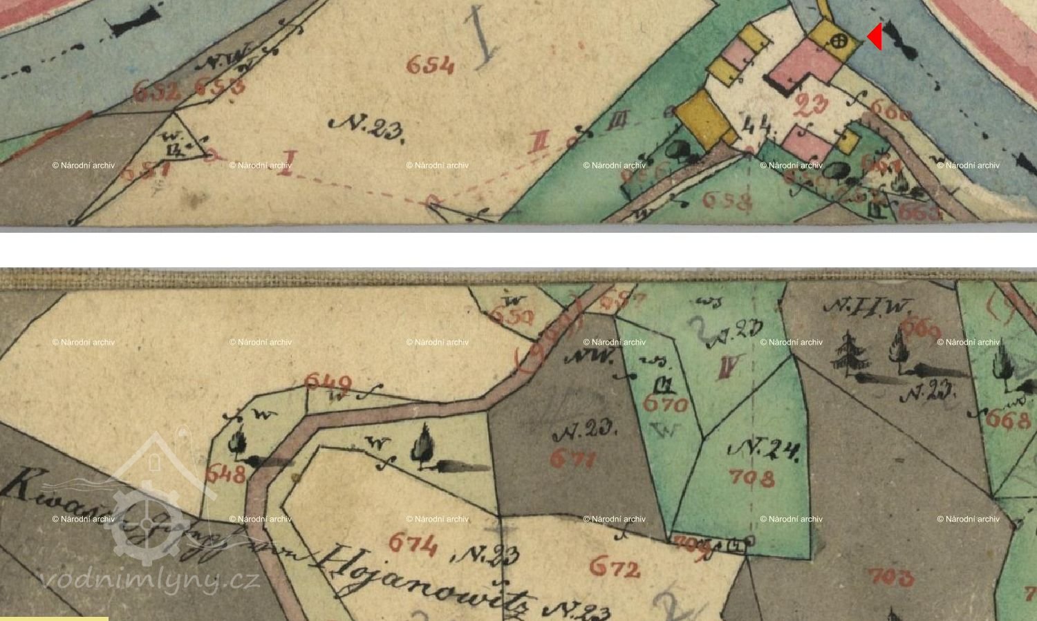 Mlýn vlastnil v r. 1838 Joseph Kwasch, v r.1930 mlýn a pilu František Navrátil. Původní č. p. bylo 23.