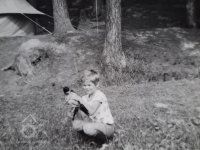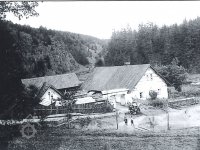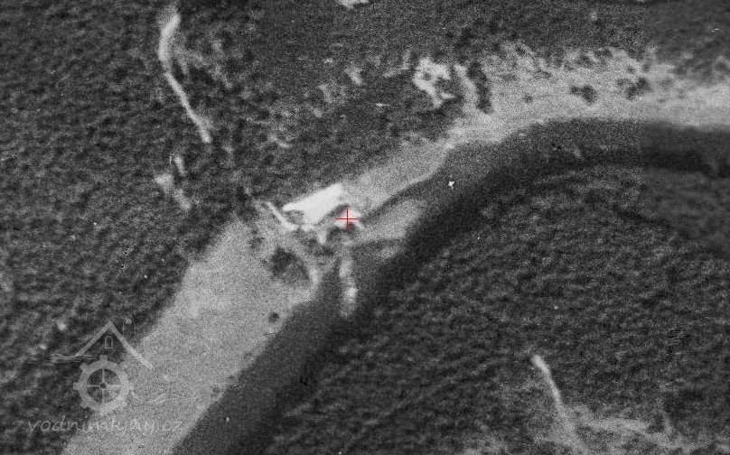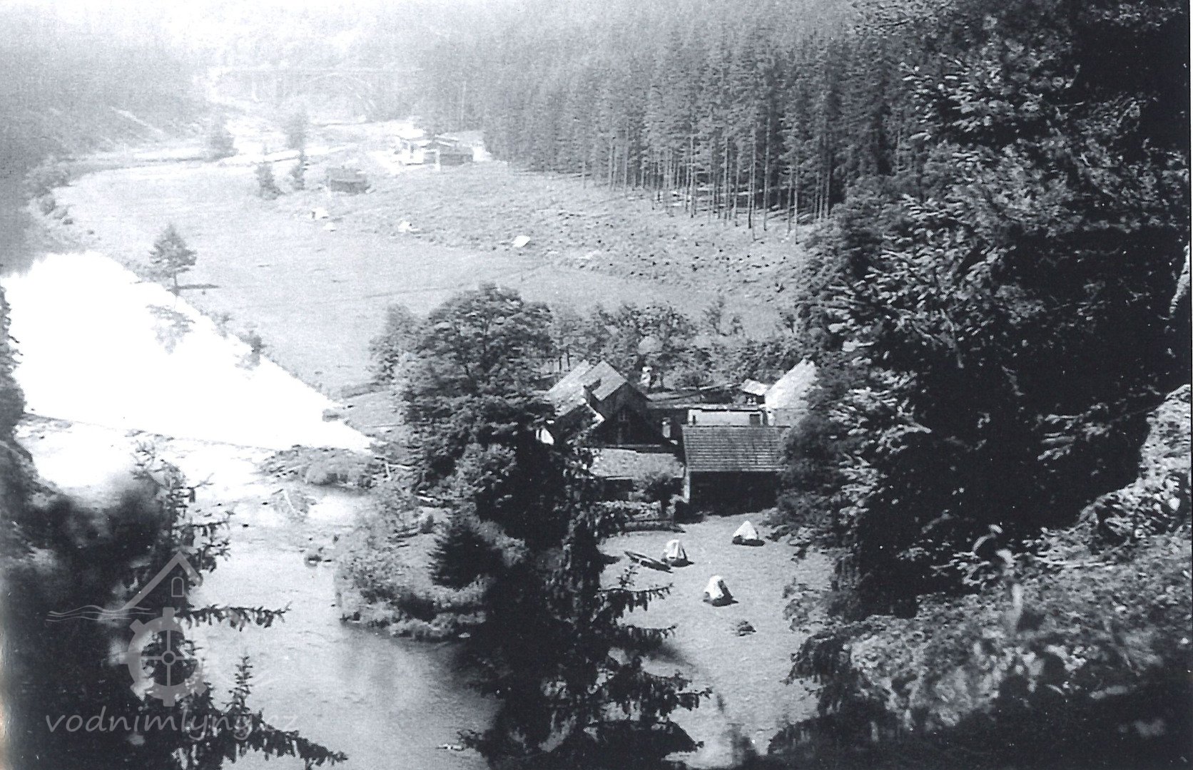 Na pohledu shora na mlýn směr most jsou vpravo pod vykáceným lesem 3 stany,1 prvni je náš s mamkou druhý je babiččin a třetí Heidlergových, tam se střidali s Matejkovými a dalšími .... byly tam potlachy nacházeli jsme tam věci z války, po zatopení jsme si půjčovali domek ve Vranici. Bohužel vetšinu fotek zabavili estébáci, byli jsme německá rodina.