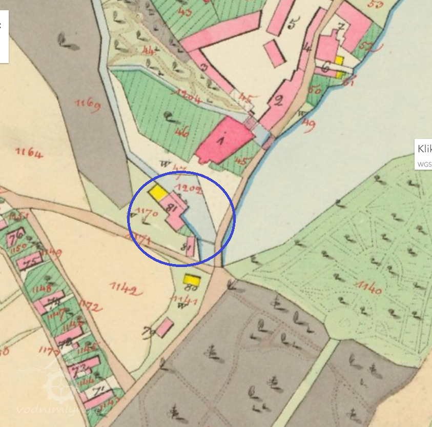 Popis1930 (mlýn): 1 kolo na svrchní vodu, hltnost 0,16 m3/s, spád 4,5 m, výkon 6 HP